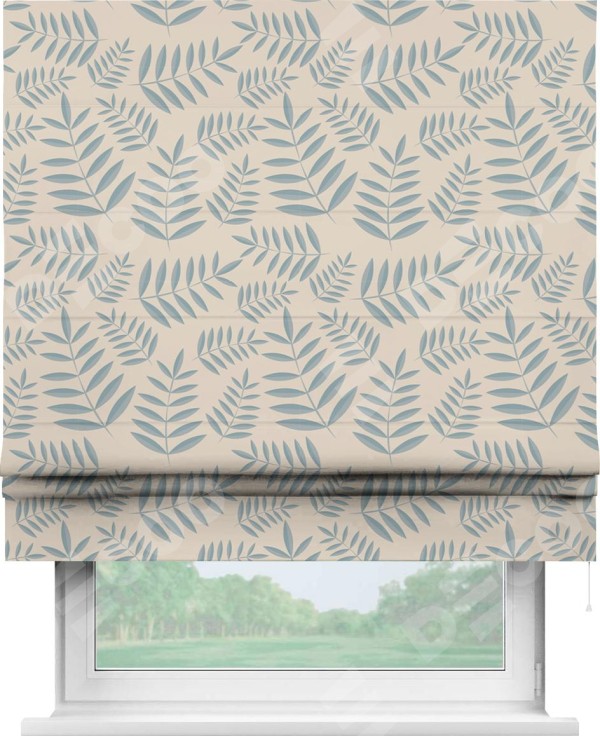 Римская штора производителя «Cortin», используется для проёма, пошита из ткани блэкаут с нанесением сублимационной печати «Веточка с листочками». Имеет универсальный механизм и подходит для монтажа: на потолок, на стену и в нишу.