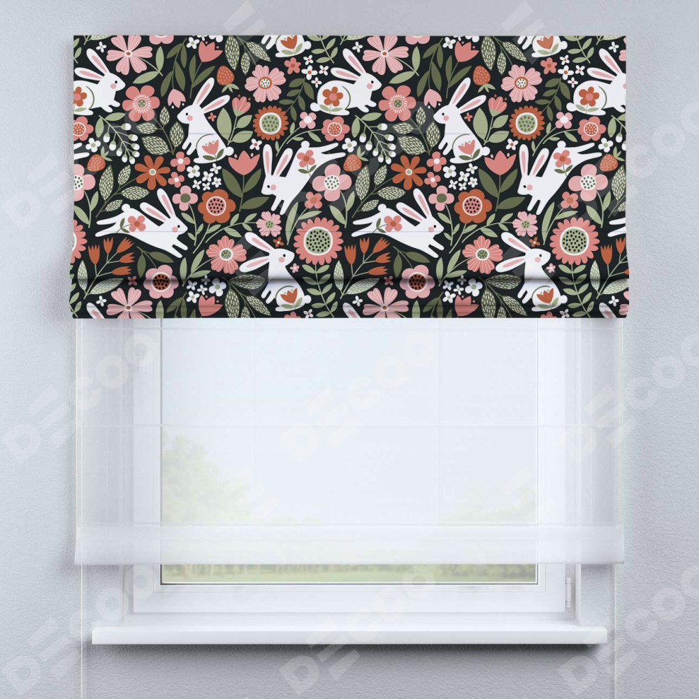 Римская штора день-ночь производителя «Cortin», используется для проёма, пошита из двух полотен, с лицевой блэкаут с нанесением сублимационной печати «Зайчики в цветнике», вторая ткань тюль (по стандарту комплектуется тюль белого цвета артикул V-01). Имеет универсальный механизм и подходит для монтажа: на потолок, на стену и в нишу.