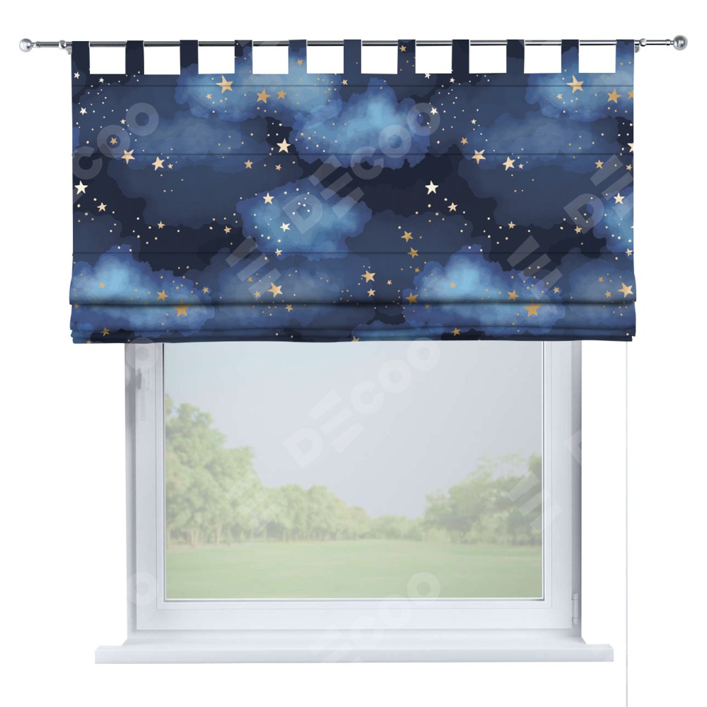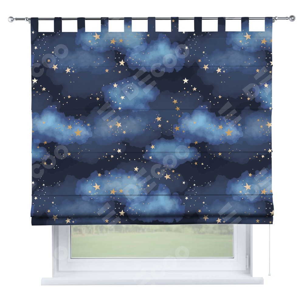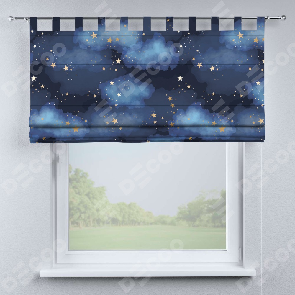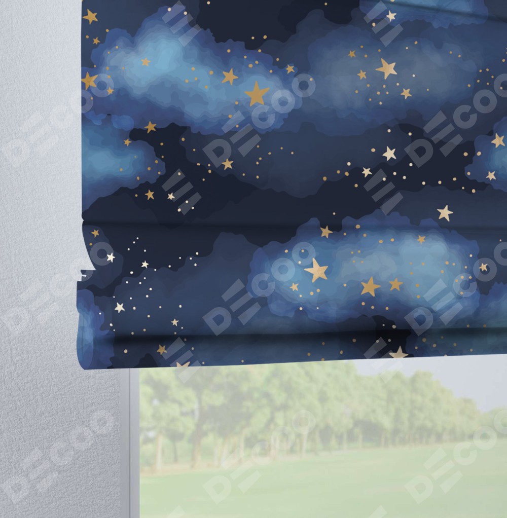 Римская штора производителя «Cortin», используется для проёма, пошита из ткани блэкаут с нанесением сублимационной печати «Золотые звёзды». Данная модель пошита на петлях, комплектуется на выбор круглым карнизом и подходит для монтажа на стену. Римская штора на петлях имеет простую систему регулировки высоты, отличительным преимуществом данной модели является простой способ монтажа. Достаточно повесить ее на трубу и штора готова!