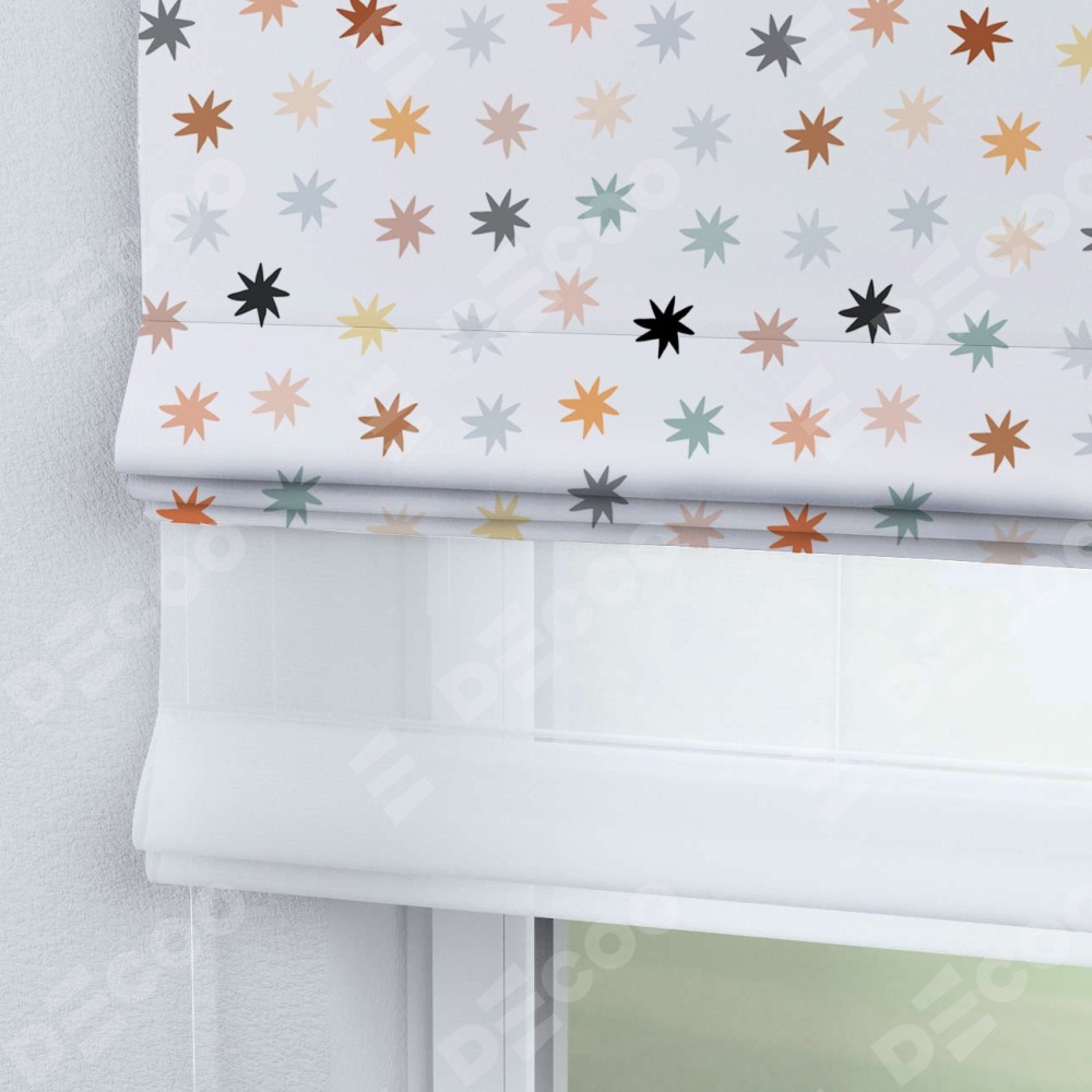 Римская штора день-ночь производителя «Cortin», используется для проёма, пошита из двух полотен, с лицевой блэкаут с нанесением сублимационной печати «Разноцветные звёзды», вторая ткань тюль (по стандарту комплектуется тюль белого цвета артикул V-01). Имеет универсальный механизм и подходит для монтажа: на потолок, на стену и в нишу.