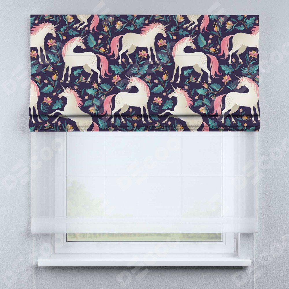 Римская штора день-ночь производителя «Cortin», используется для проёма, пошита из двух полотен, с лицевой блэкаут с нанесением сублимационной печати «Сказочные единороги», вторая ткань тюль (по стандарту комплектуется тюль белого цвета артикул V-01). Имеет универсальный механизм и подходит для монтажа: на потолок, на стену и в нишу.