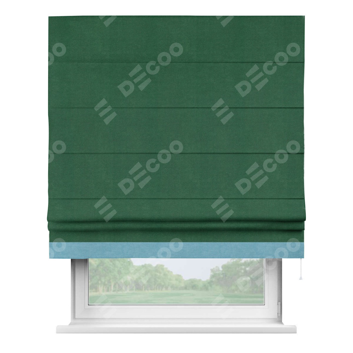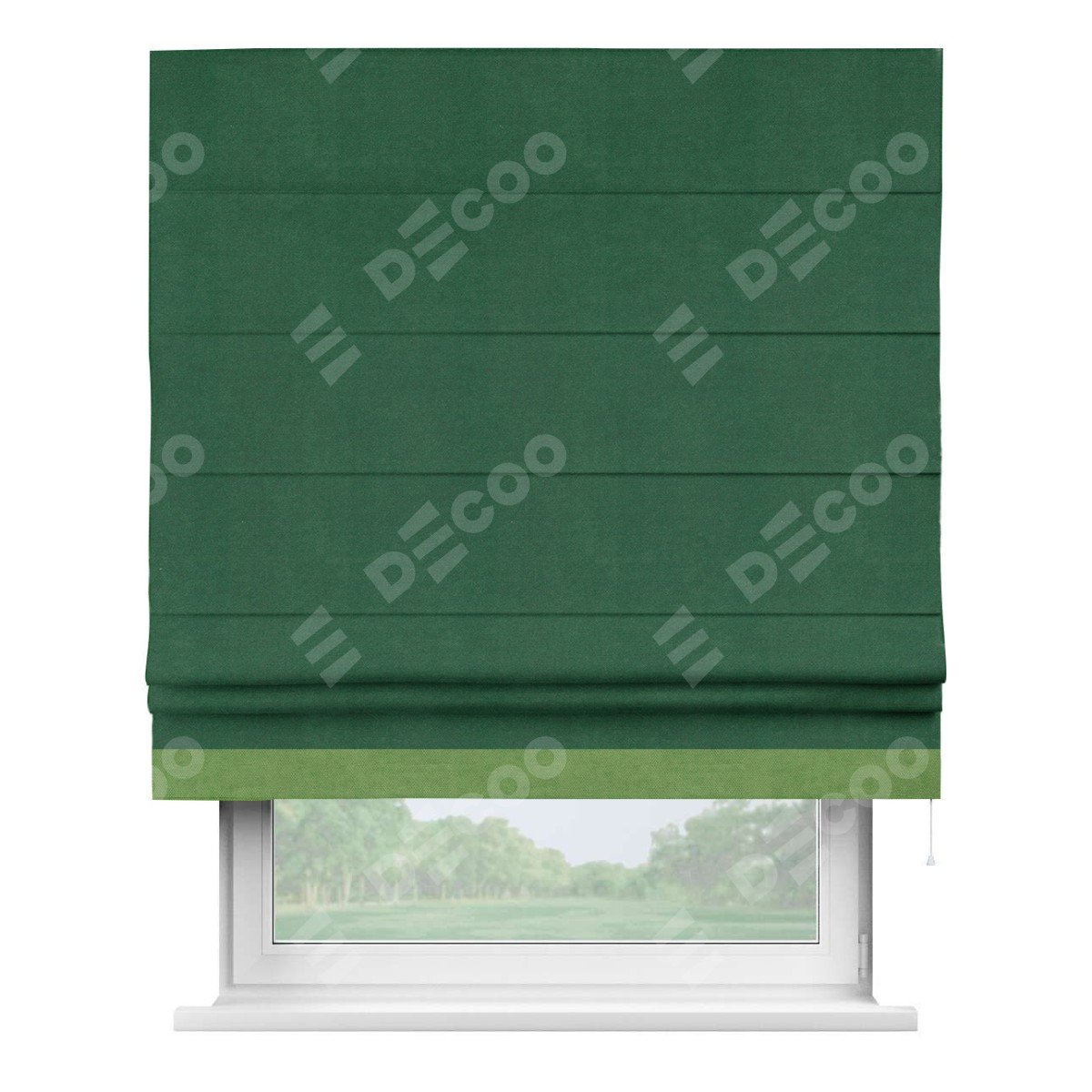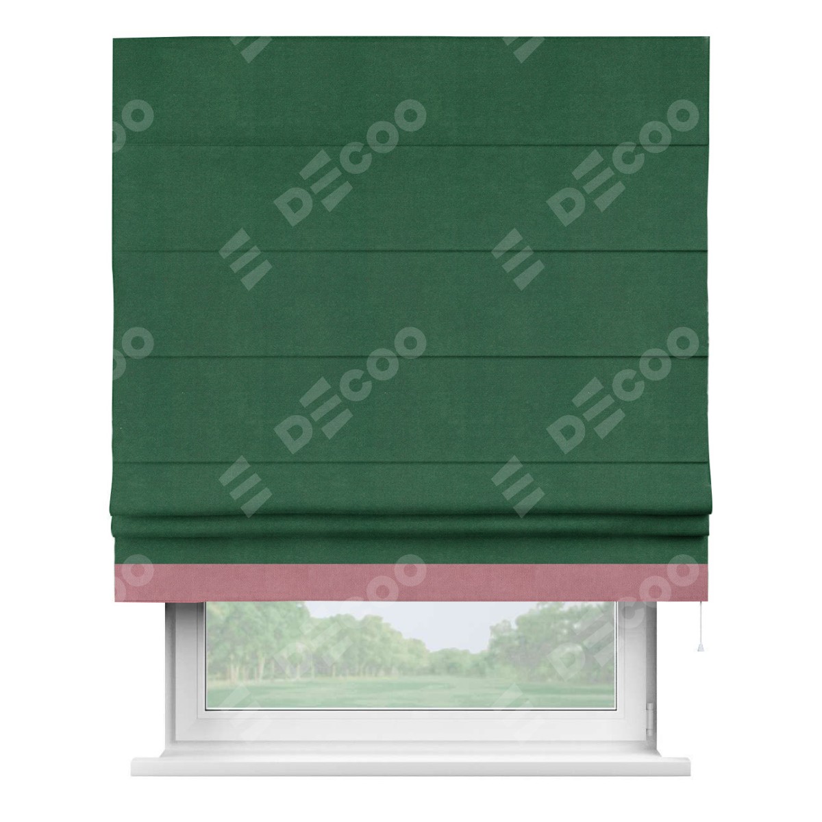 Римская штора производителя «Cortin», используется для проёма, пошита из ткани вельвет зеленый, артикул ткани 85546. Отделка шторы кантом «Джестер», ткань для канта используется из вельвета разной расцветки на выбор. Имеет универсальный механизм и подходит для монтажа: на потолок, на стену и в нишу.