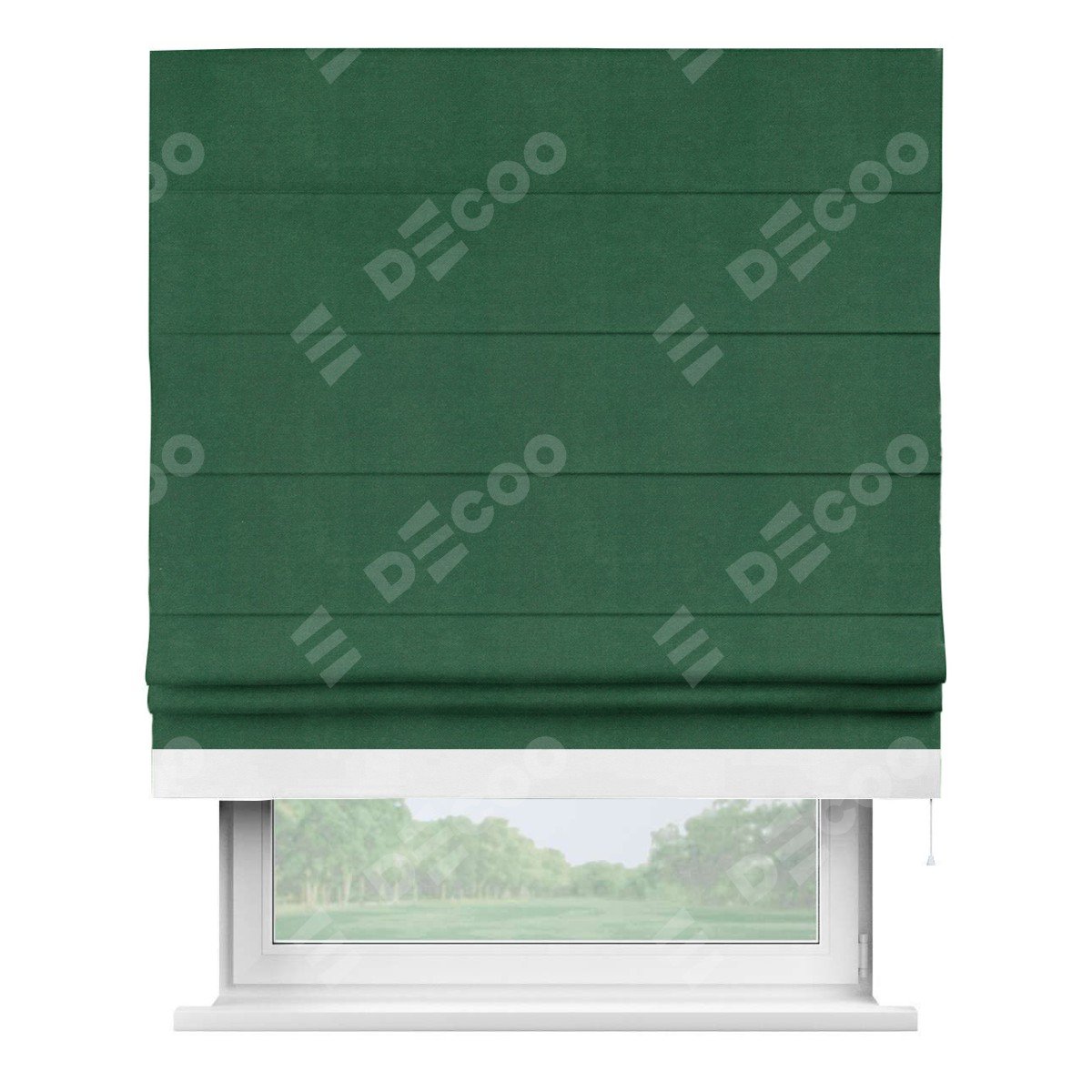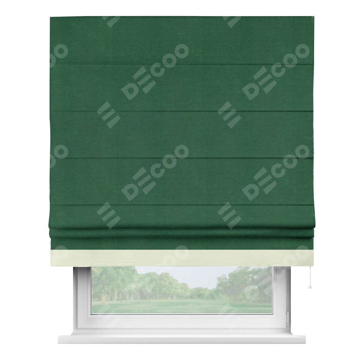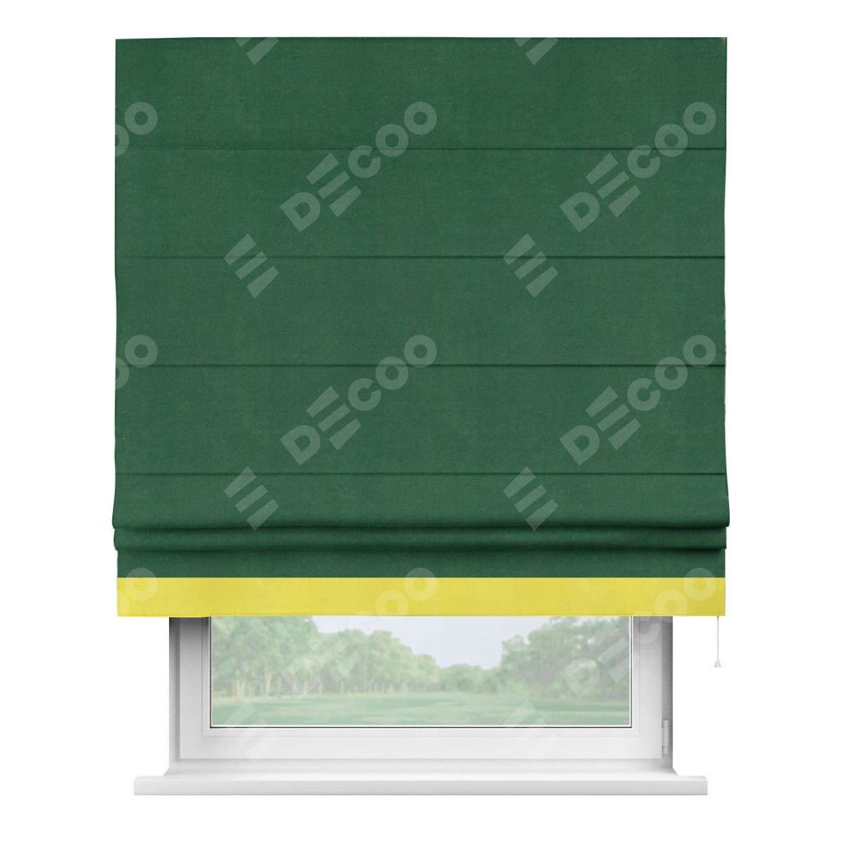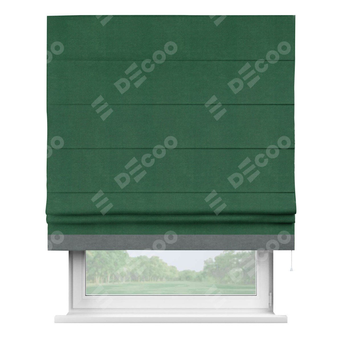 Римская штора производителя «Cortin», используется для проёма, пошита из ткани вельвет зеленый, артикул ткани 85546. Отделка шторы кантом «Джестер», ткань для канта используется из вельвета разной расцветки на выбор. Имеет универсальный механизм и подходит для монтажа: на потолок, на стену и в нишу.