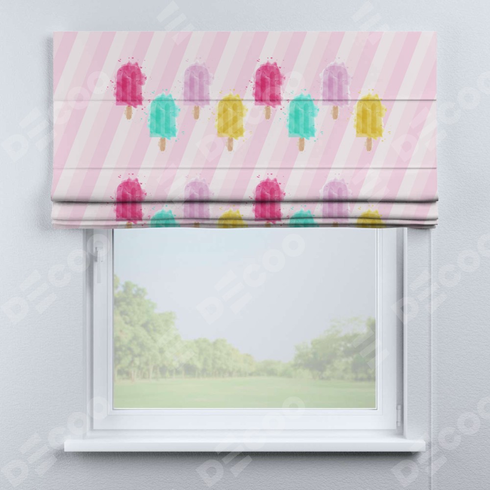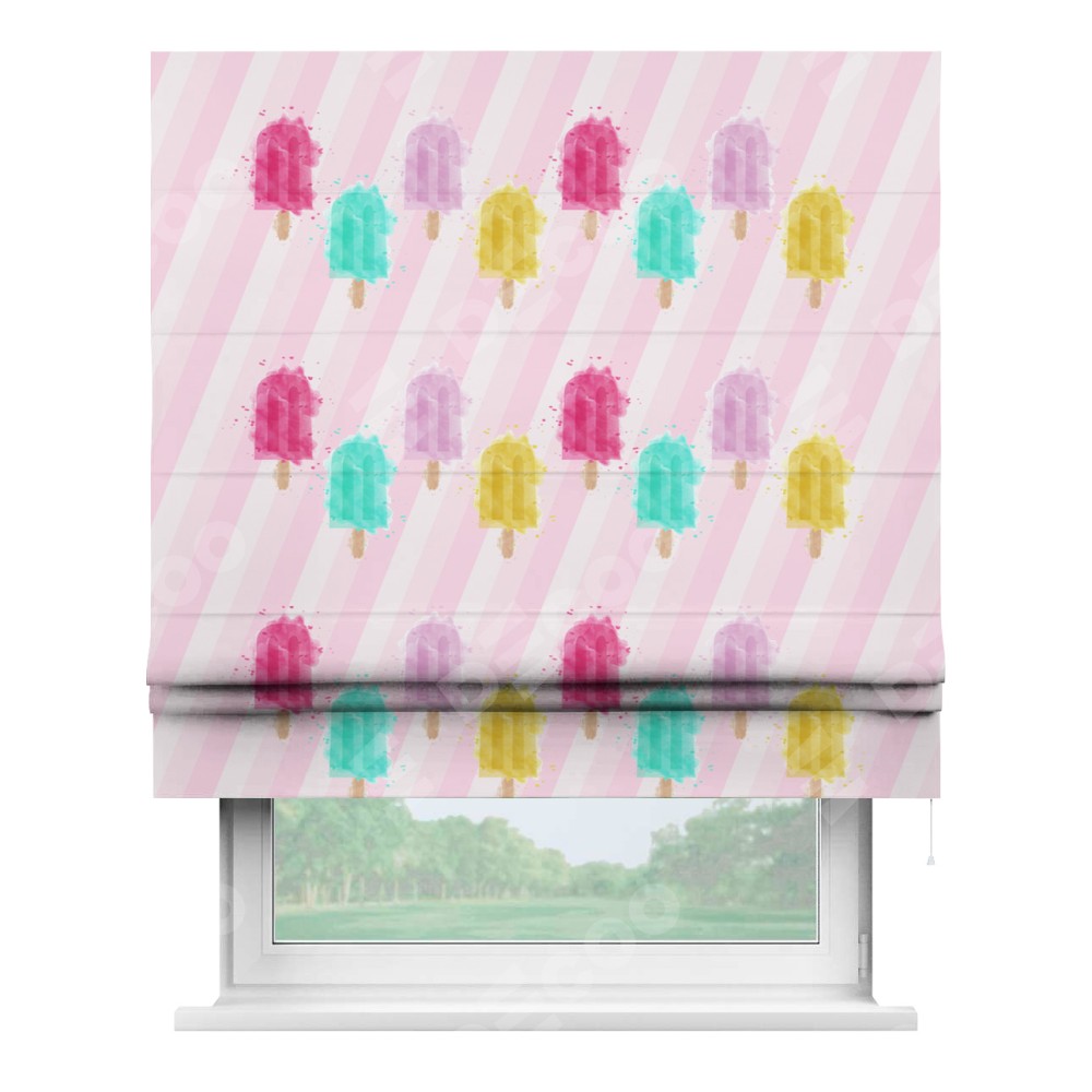 Римская штора производителя «Cortin», используется для проёма, пошита из ткани блэкаут с нанесением сублимационной печати «Фруктовое мороженое». Имеет универсальный механизм и подходит для монтажа: на потолок, на стену и в нишу.