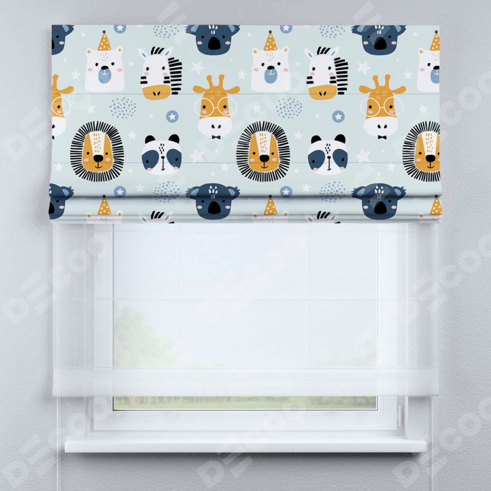 Римская штора день-ночь производителя «Cortin», используется для проёма, пошита из двух полотен, с лицевой блэкаут с нанесением сублимационной печати «Чудесный зоопарк», вторая ткань тюль (по стандарту комплектуется тюль белого цвета артикул V-01). Имеет универсальный механизм и подходит для монтажа: на потолок, на стену и в нишу.