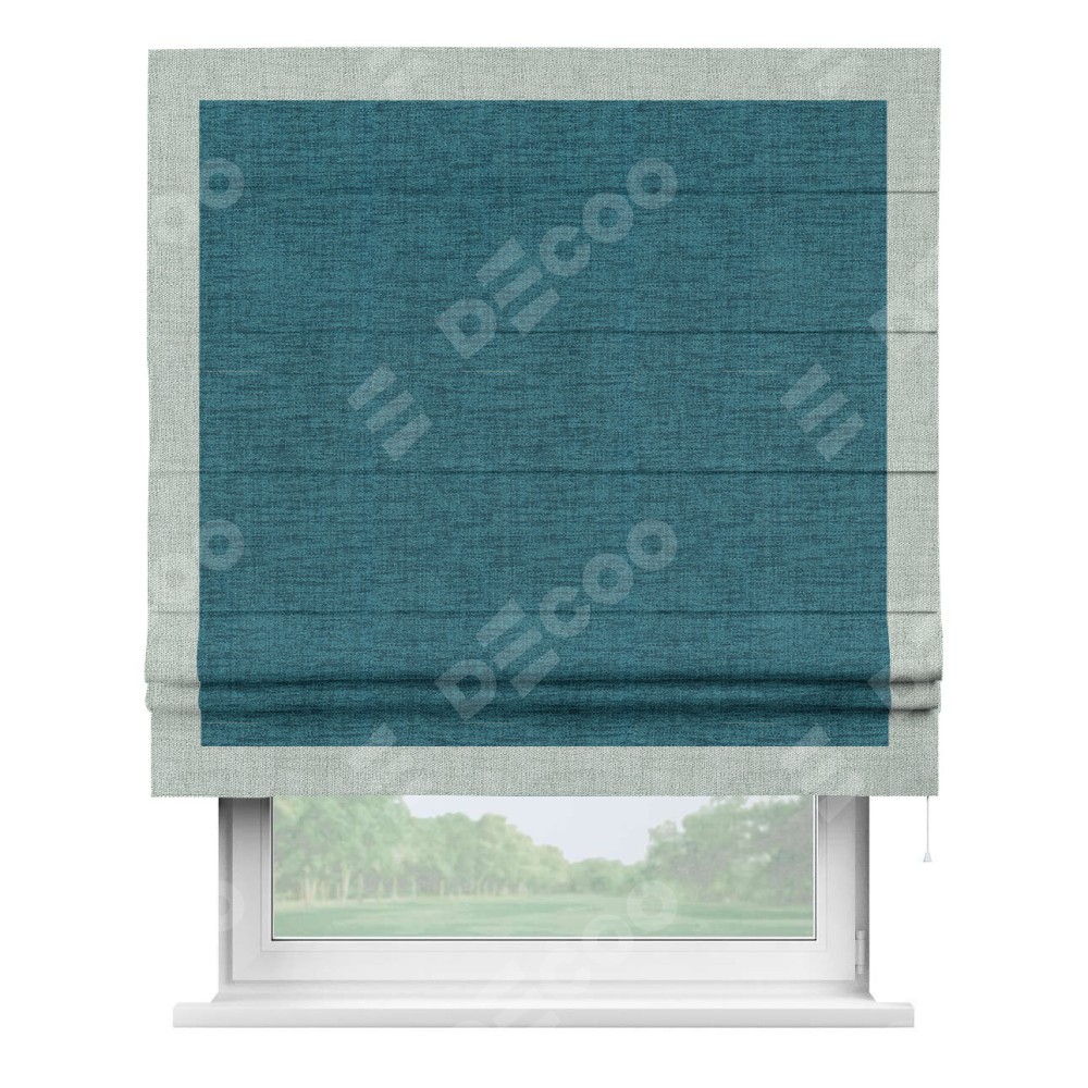 Римская штора производителя «Cortin», используется для проёма, пошита из ткани рогожка димаут синий, артикул 80422. Отделка шторы кантом «Чесс», ткань для канта используется из рогожки димаут разной расцветки на выбор. Имеет универсальный механизм и подходит для монтажа: на потолок, на стену и в нишу.