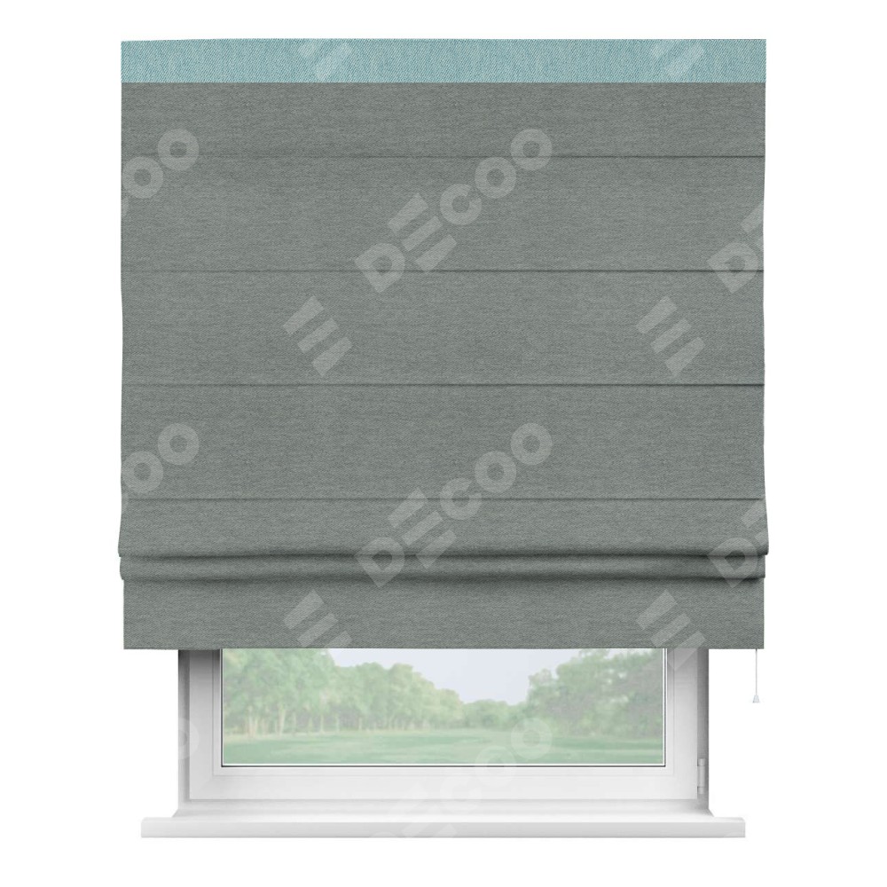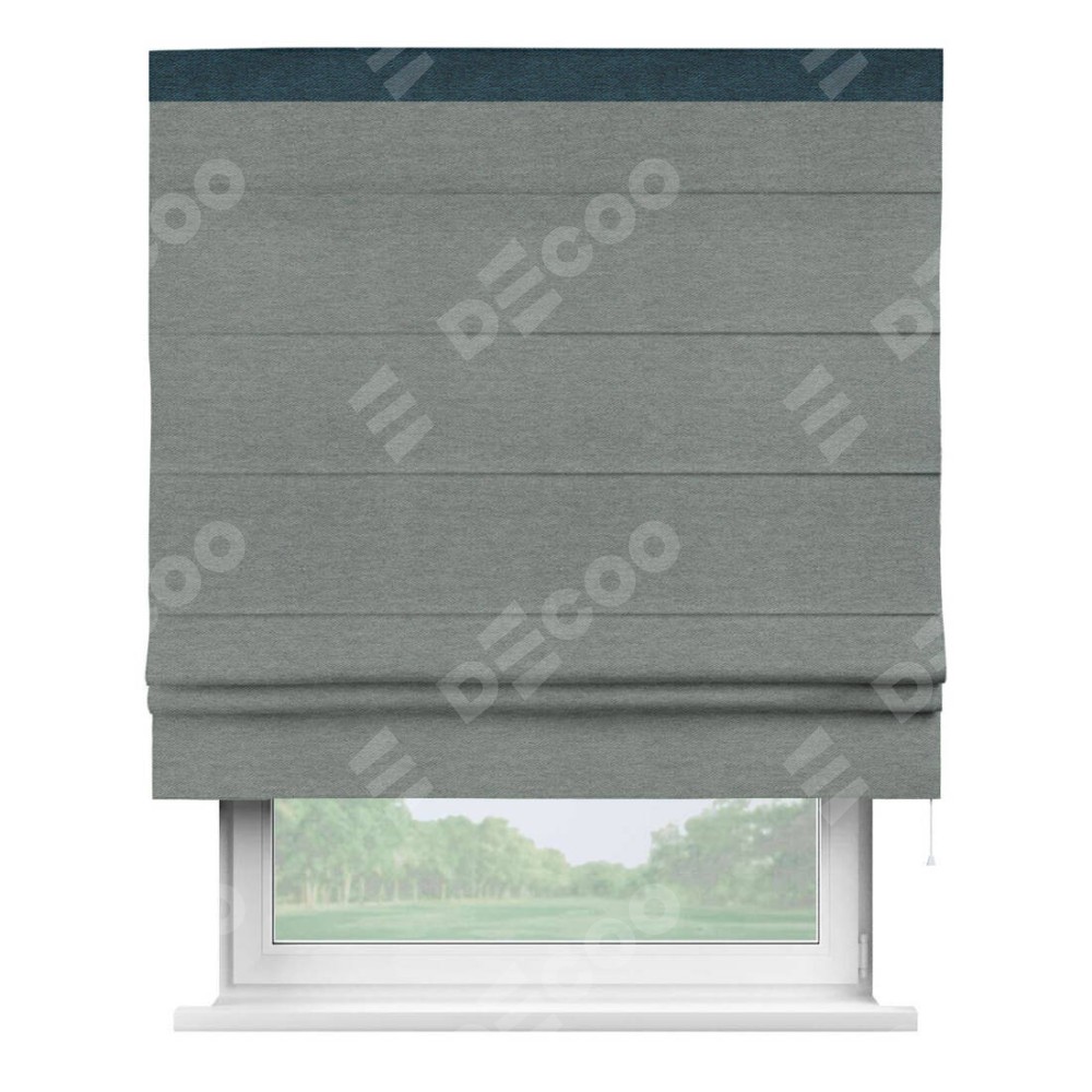 Римская штора производителя «Cortin», используется для проёма, пошита из ткани твид блэкаут серый, артикул 21577. Отделка шторы кантом «Кинг», ткань для канта используется из твида разной расцветки на выбор. Имеет универсальный механизм и подходит для монтажа: на потолок, на стену и в нишу.