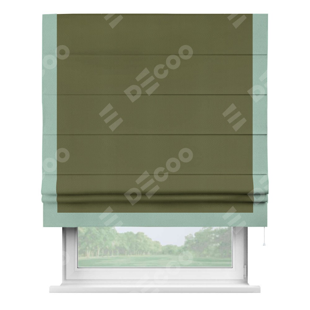 Римская штора производителя «Cortin», используется для проёма, пошита из ткани блэкаут однотонный зелёный, артикул ткани 81859. Отделка шторы кантом «Виктория», ткань для канта используется из блэкаута однотонного разной расцветки на выбор. Имеет универсальный механизм и подходит для монтажа: на потолок, на стену и в нишу.