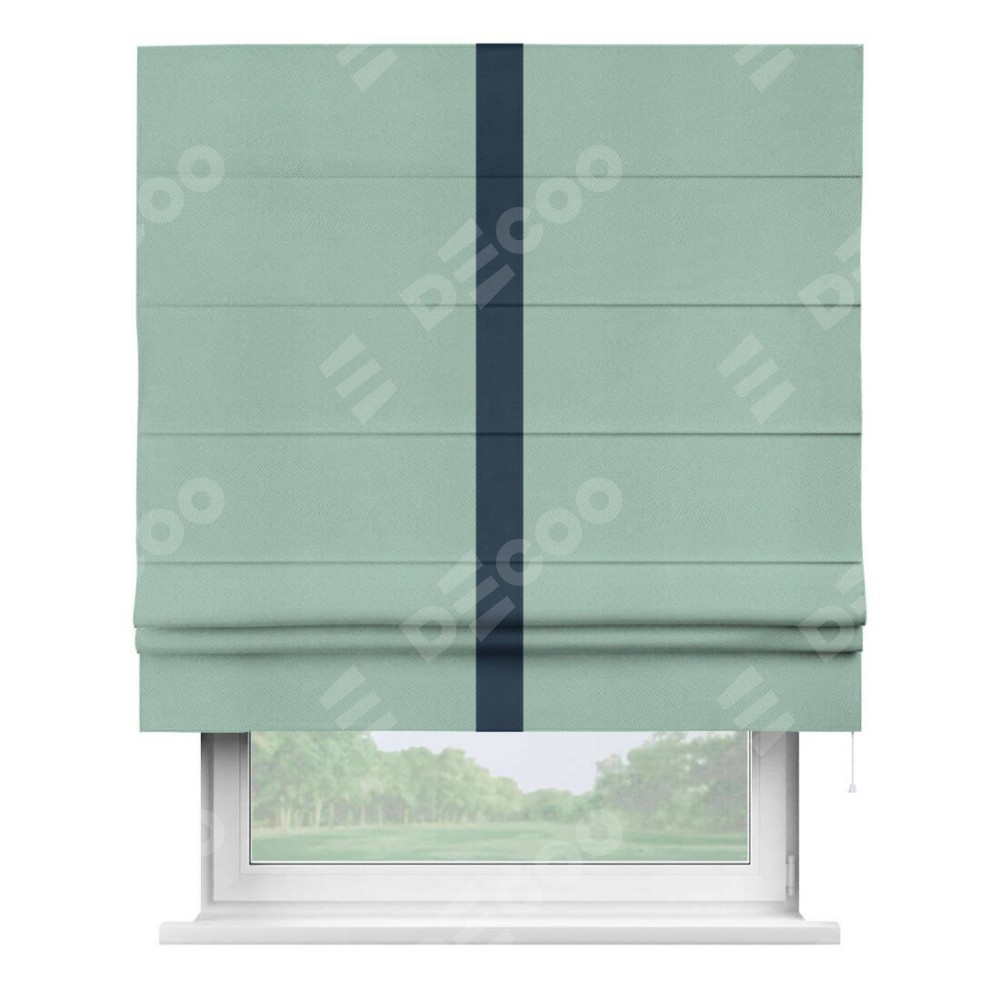 Римская штора производителя «Cortin», используется для проёма, пошита из ткани блэкаут однотонный ментоловый, артикул ткани 29584. Отделка шторы кантом «Хайвей», ткань для канта используется из блэкаута однотонного разной расцветки на выбор. Имеет универсальный механизм и подходит для монтажа: на потолок, на стену и в нишу.