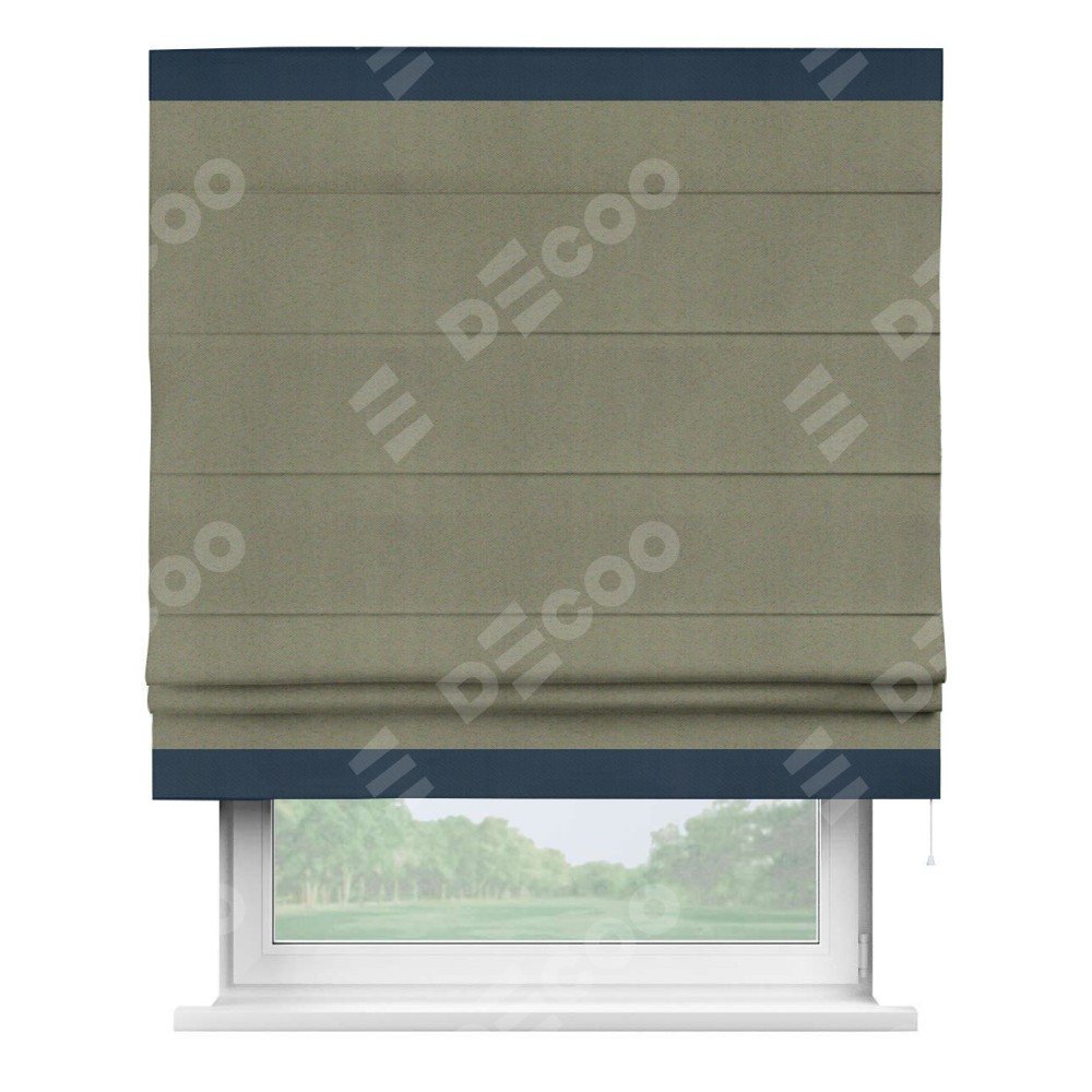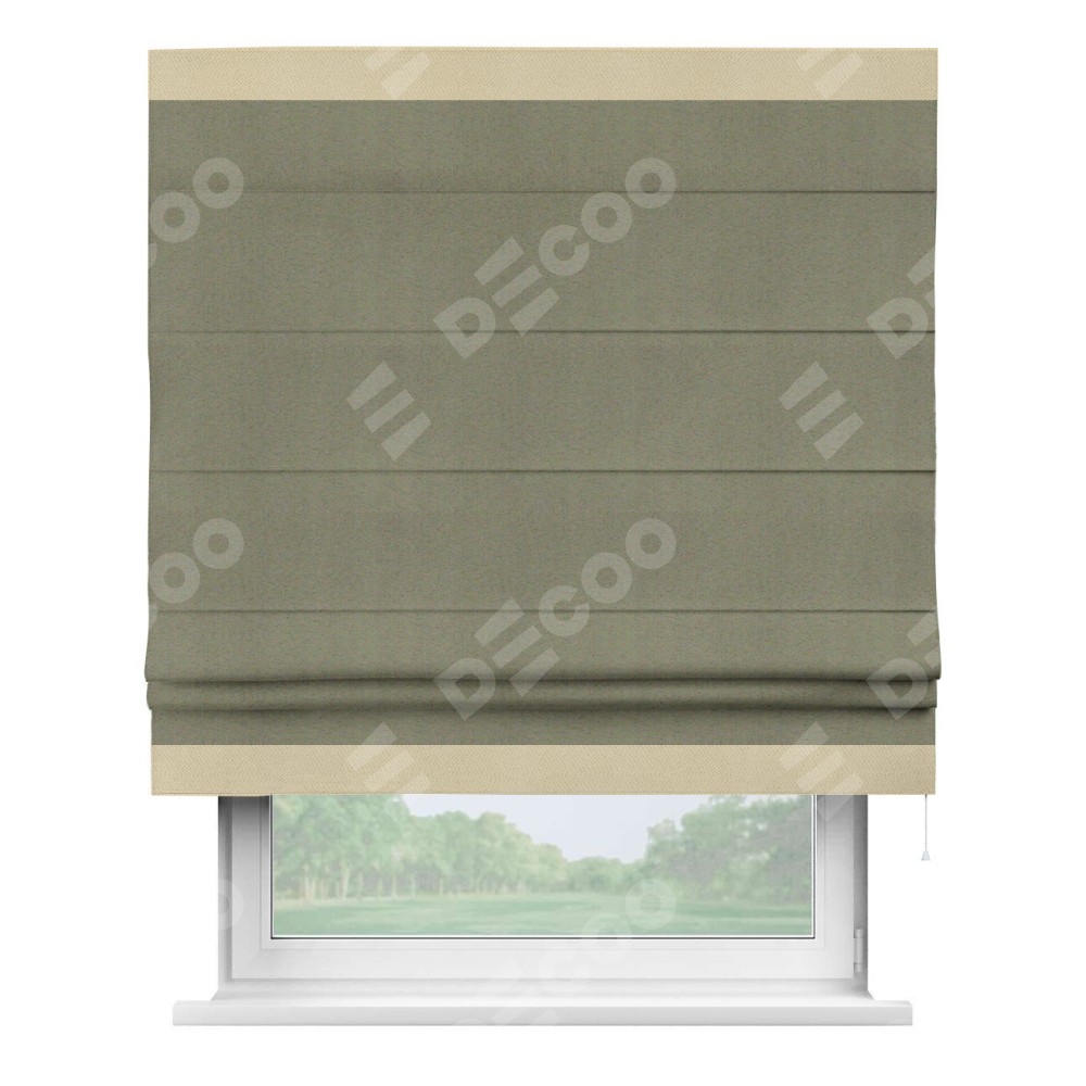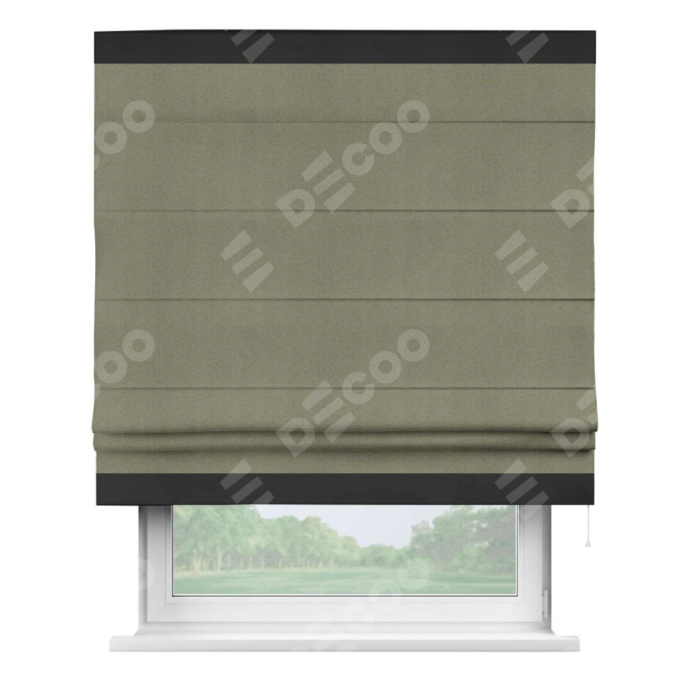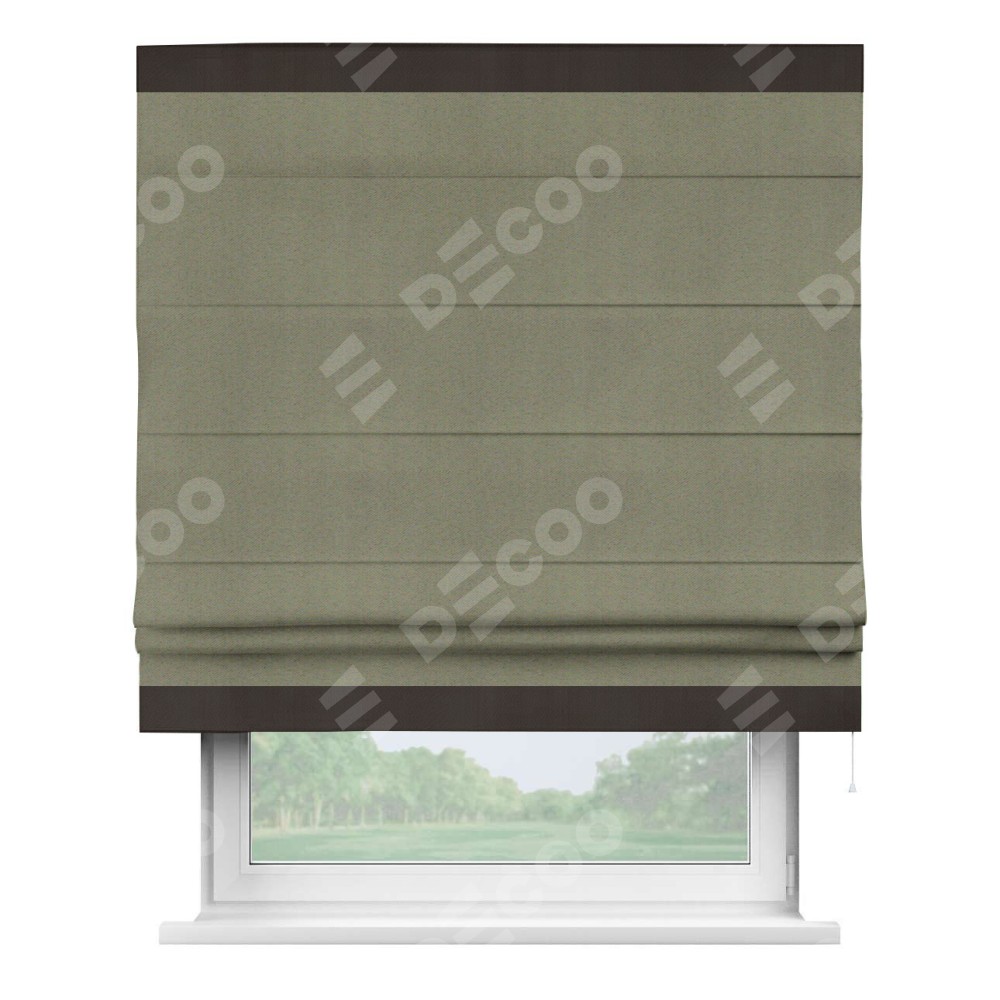 Римская штора производителя «Cortin», используется для проёма, пошита из ткани блэкаут однотонный серо-коричневый, артикул ткани 29568. Отделка шторы кантом «Горизонт», ткань для канта используется из блэкаута однотонного разной расцветки на выбор. Имеет универсальный механизм и подходит для монтажа: на потолок, на стену и в нишу.