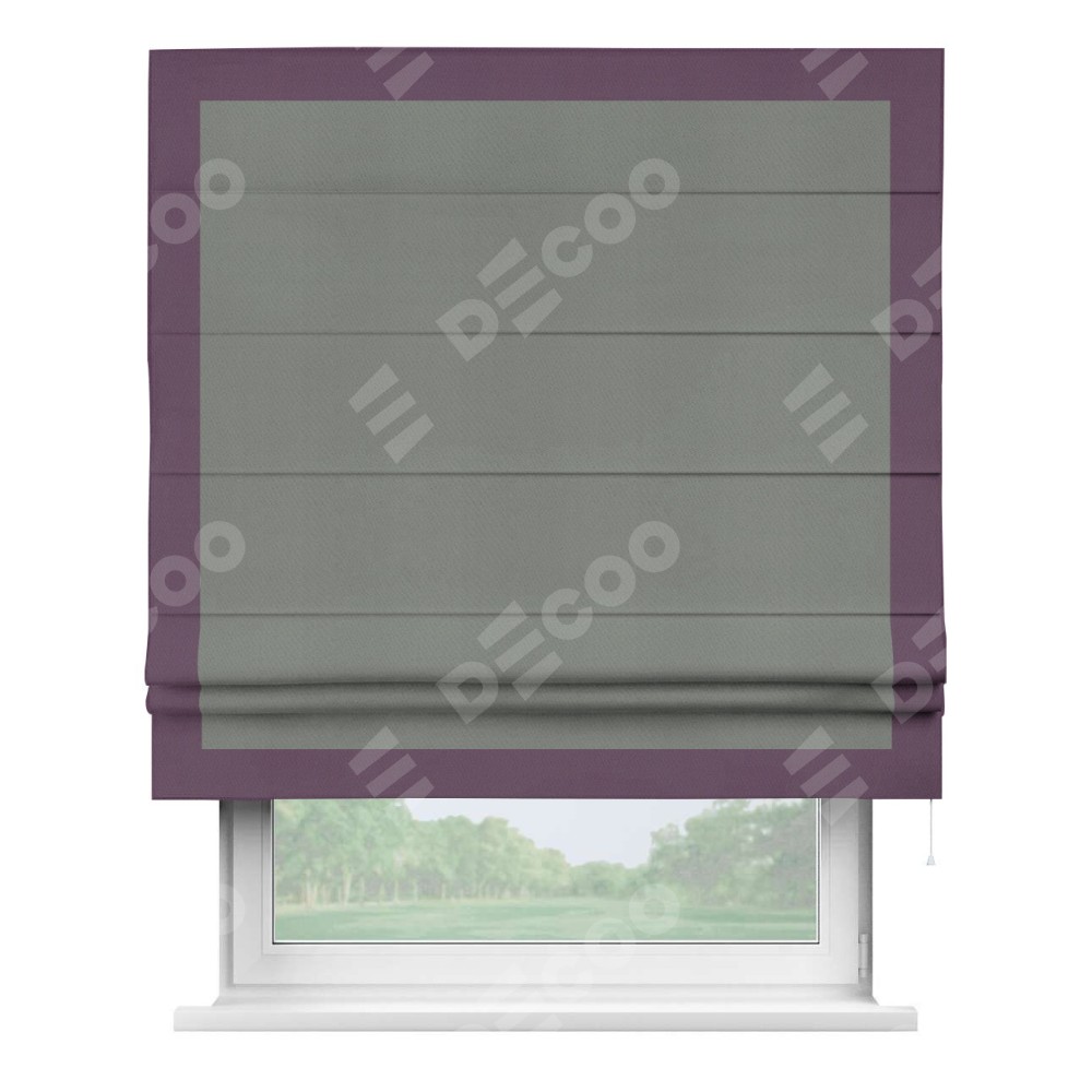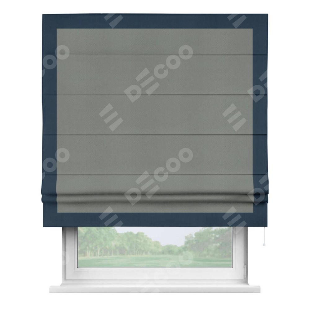 Римская штора производителя «Cortin», используется для проёма, пошита из ткани блэкаут однотонный тёмно-серый, артикул ткани 18077. Отделка шторы кантом «Чесс», ткань для канта используется из блэкаута однотонного разной расцветки на выбор. Имеет универсальный механизм и подходит для монтажа: на потолок, на стену и в нишу.