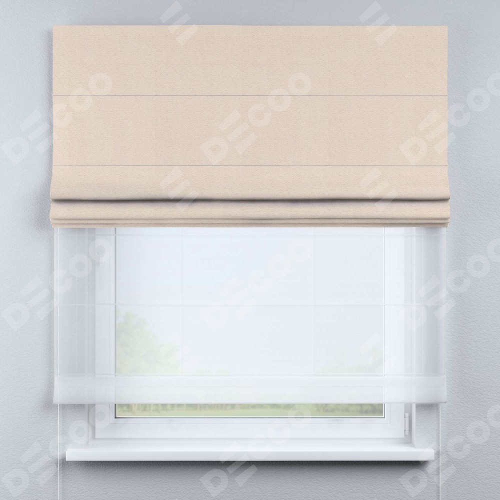 Римская штора день-ночь производителя «Cortin», используется для проёма, пошита из двух полотен, с лицевой стороны блэкаут тиснение с блеском розовая пудра артикул 34632, вторая ткань тюль (по стандарту комплектуется тюль белого цвета артикул V-01). Изнаночная сторона основного материала черного цвета, что обеспечивает необходимую светонепроницаемость. Имеет универсальный механизм и подходит для монтажа: на потолок, на стену и в нишу.