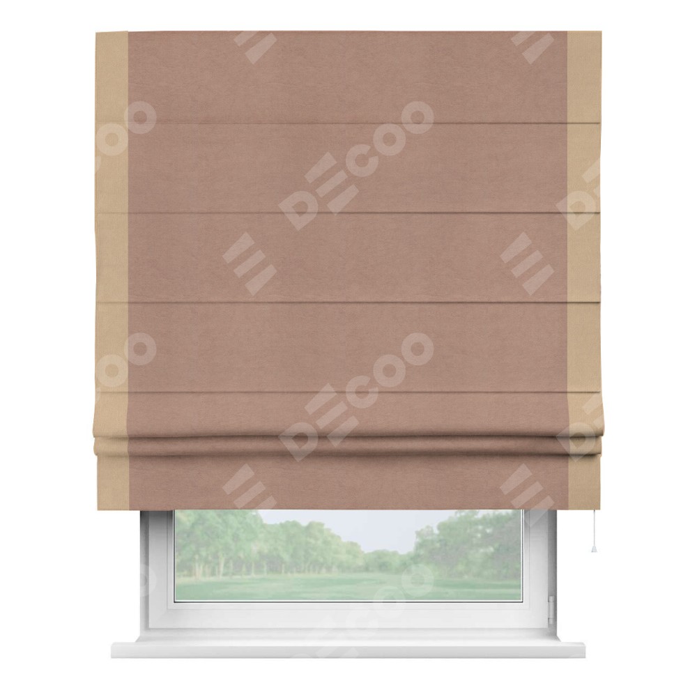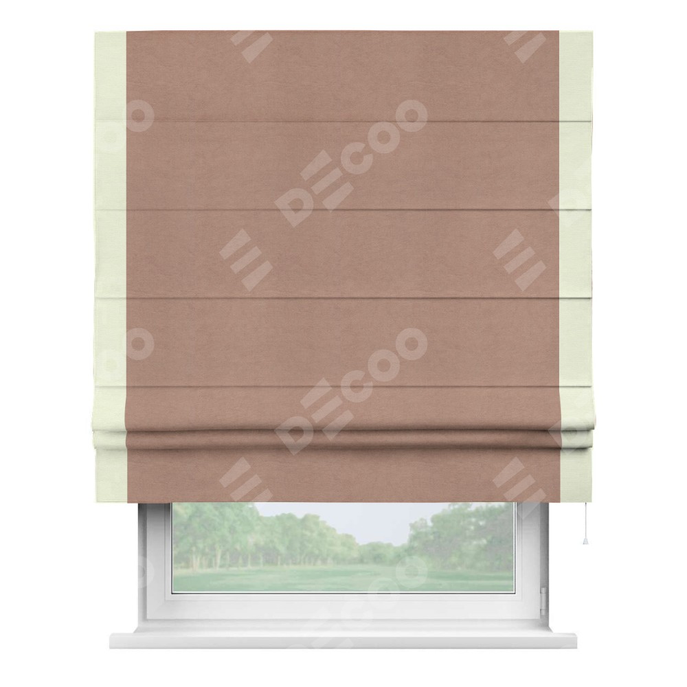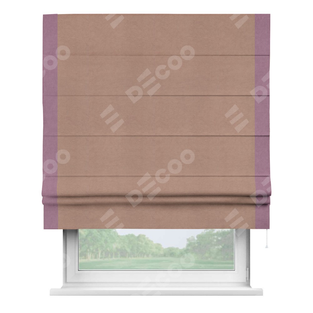 Римская штора производителя «Cortin», используется для проёма, пошита из ткани вельвет брусничный джем, артикул ткани 17750. Отделка шторы кантом «Стрим Дуо», ткань для канта используется из вельвета разной расцветки на выбор. Имеет универсальный механизм и подходит для монтажа: на потолок, на стену и в нишу.