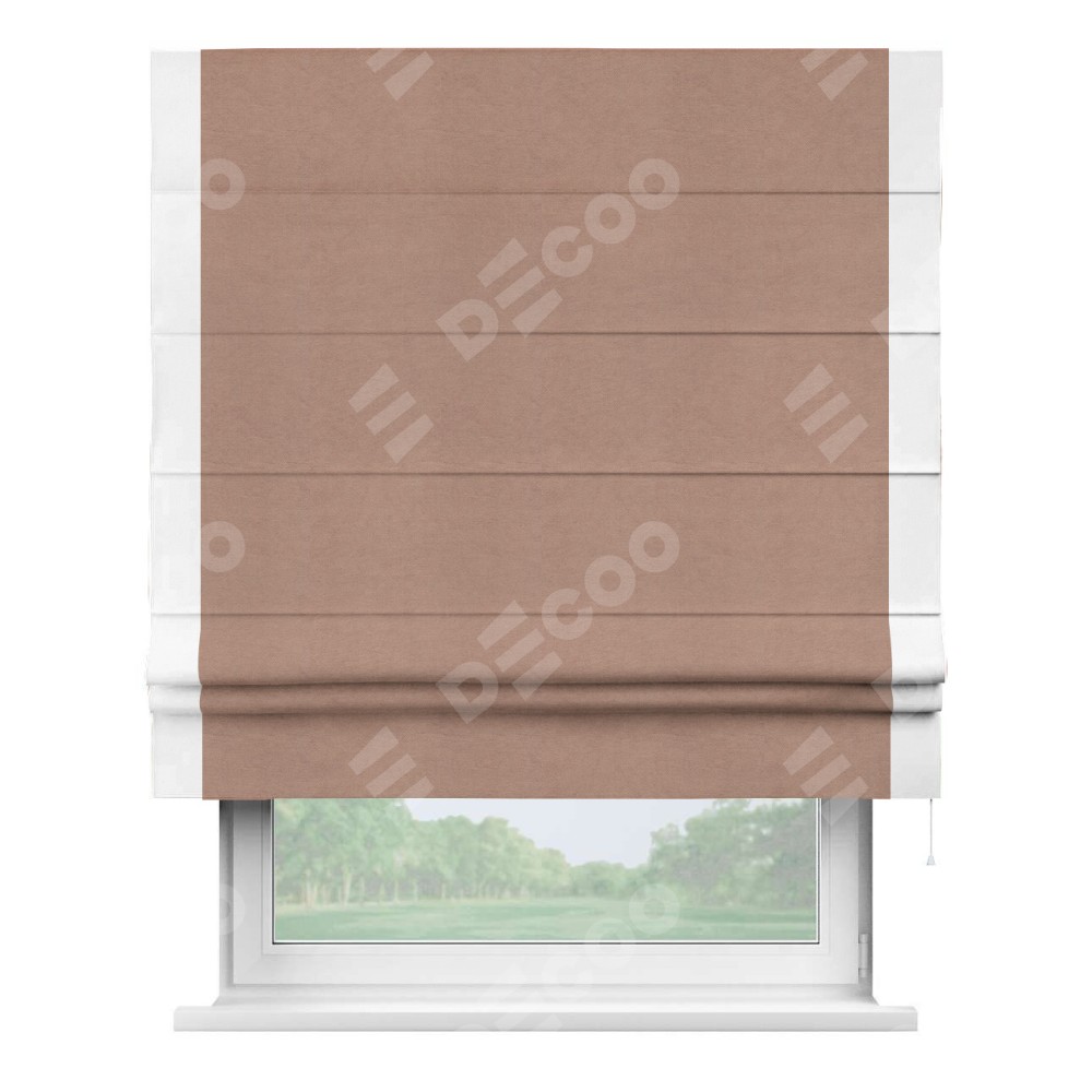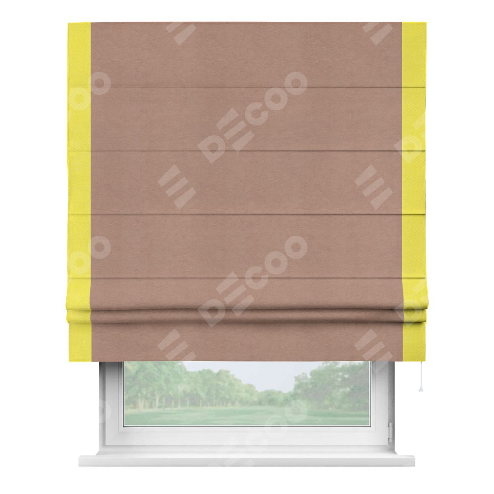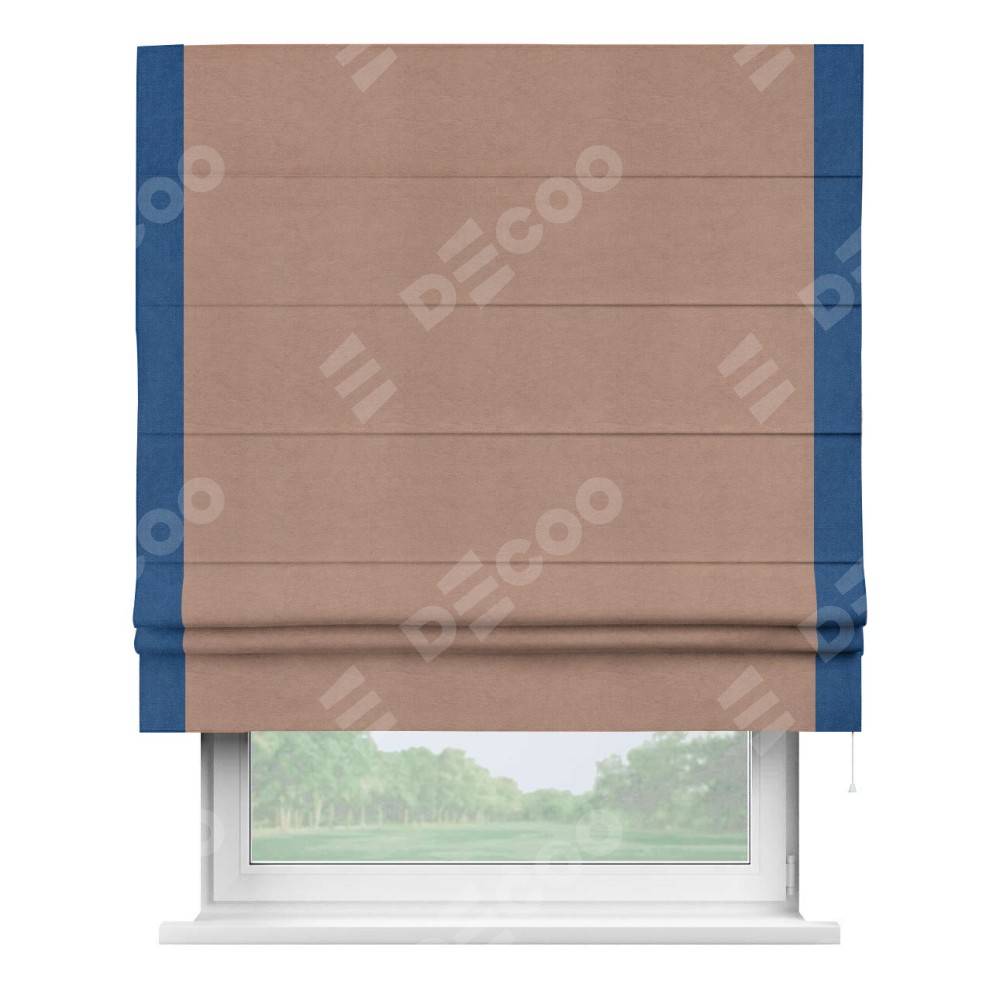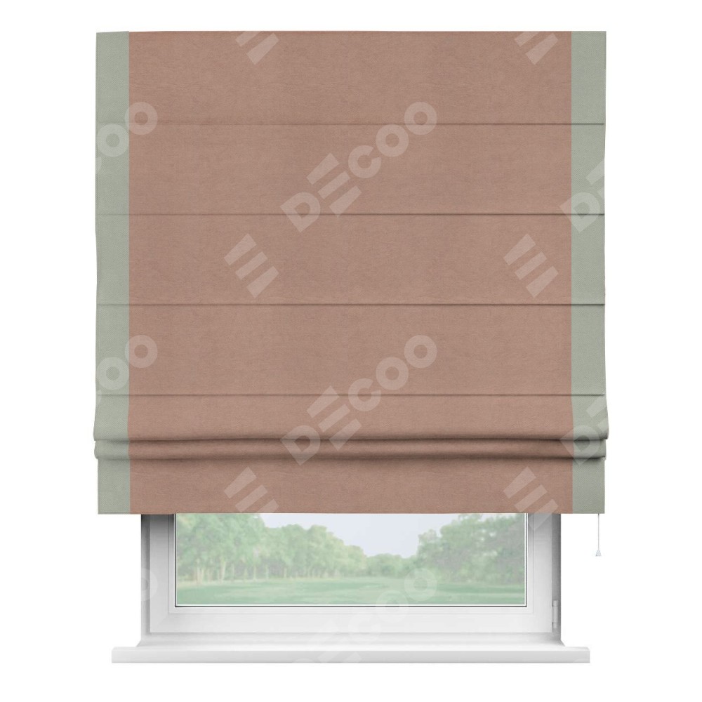 Римская штора производителя «Cortin», используется для проёма, пошита из ткани вельвет брусничный джем, артикул ткани 17750. Отделка шторы кантом «Стрим Дуо», ткань для канта используется из вельвета разной расцветки на выбор. Имеет универсальный механизм и подходит для монтажа: на потолок, на стену и в нишу.