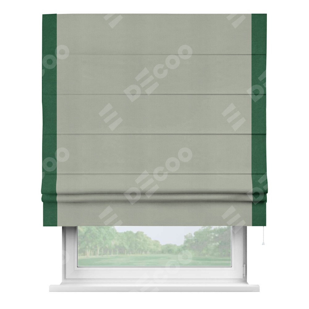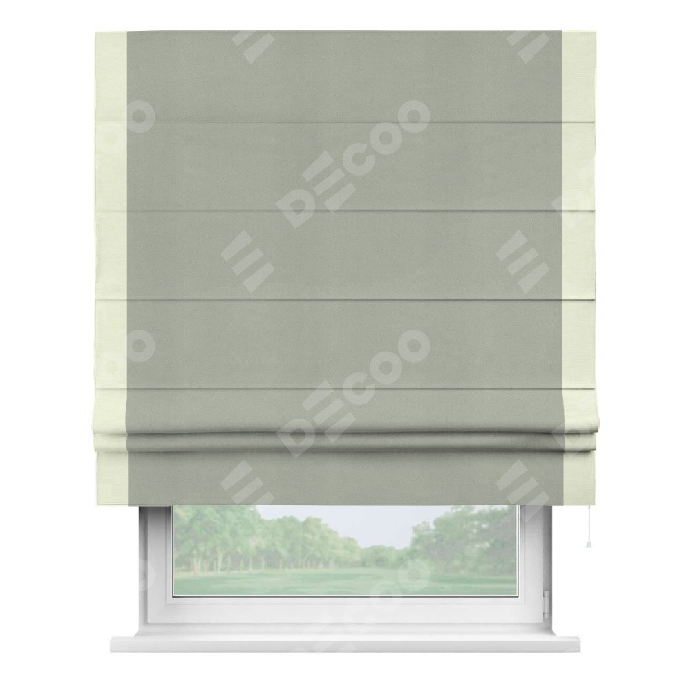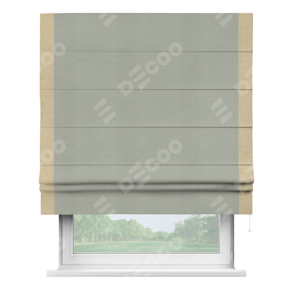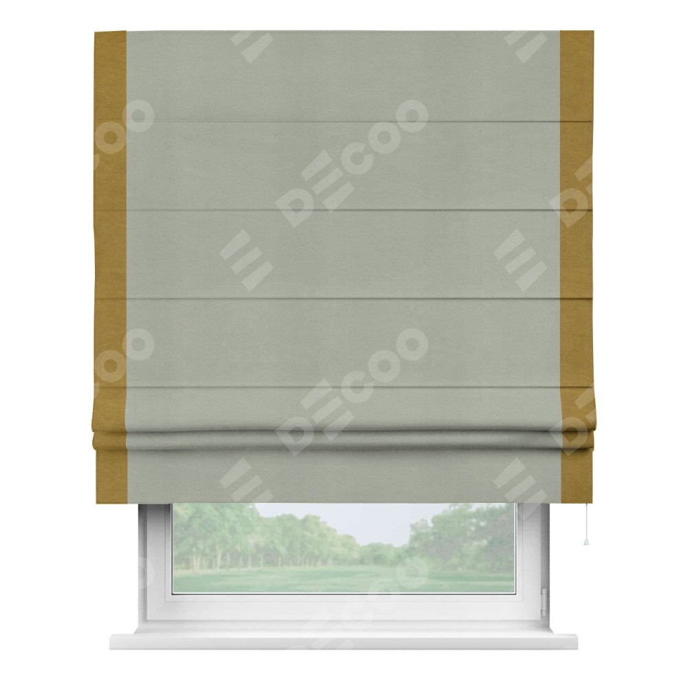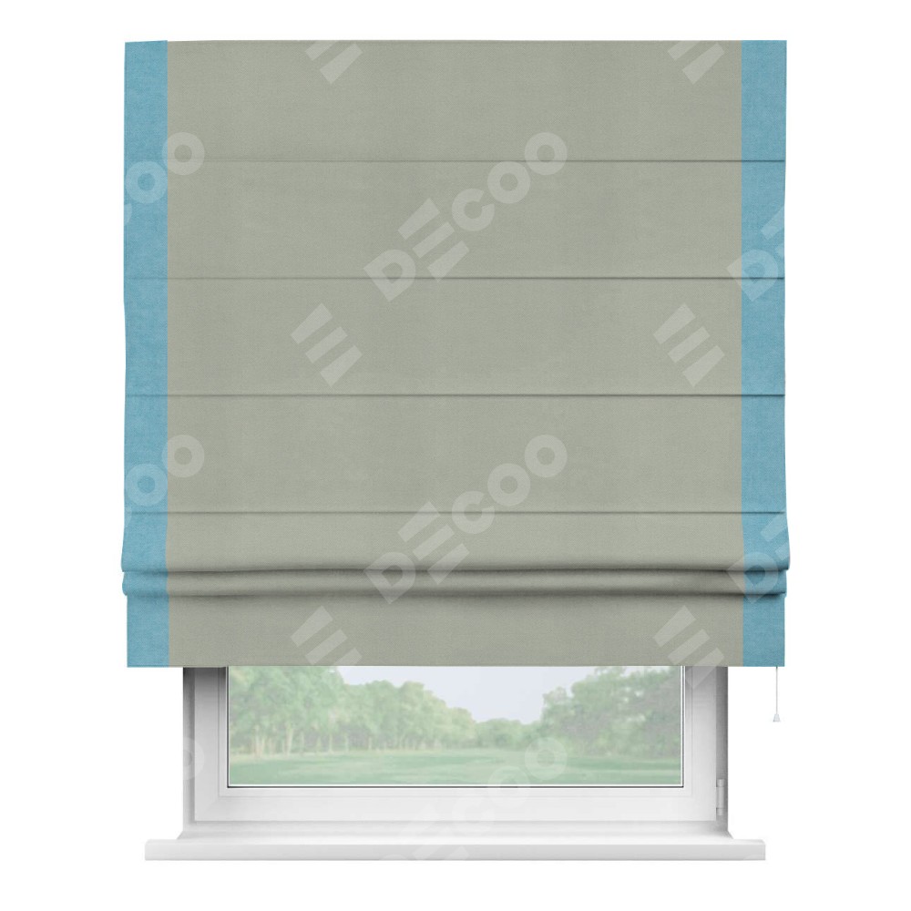 Римская штора производителя «Cortin», используется для проёма, пошита из ткани вельвет cветло-серый, артикул ткани 30981. Отделка шторы кантом «Стрим Дуо», ткань для канта используется из вельвета разной расцветки на выбор. Имеет универсальный механизм и подходит для монтажа: на потолок, на стену и в нишу.