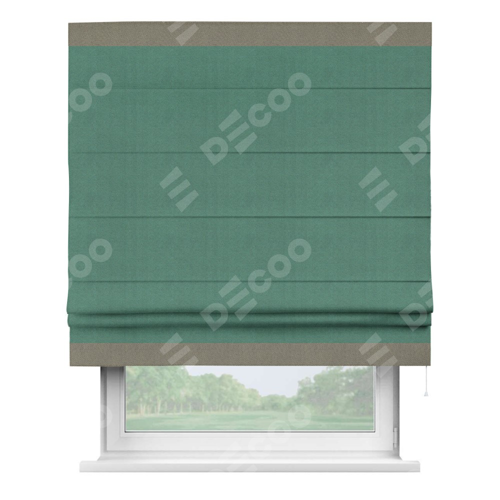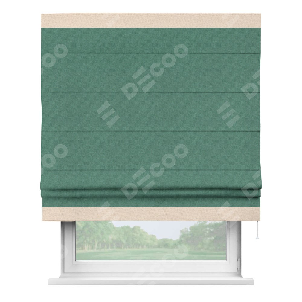 Римская штора производителя «Cortin», используется для проёма, пошита из ткани блэкаут с блеском изумрудный, артикул 34628. Отделка шторы кантом «Горизонт», ткань для канта используется из блэкаута с блеском разной расцветки на выбор. Изнаночная сторона материала черного цвета, что обеспечивает необходимую светонепроницаемость. Имеет универсальный механизм и подходит для монтажа: на потолок, на стену и в нишу.