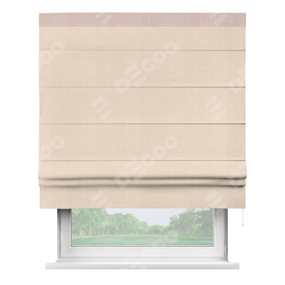Римская штора производителя «Cortin», используется для проёма, пошита из ткани блэкаут с блеском розовая пудра, артикул 34632. Отделка шторы кантом «Кинг», ткань для канта используется из блэкаута с блеском разной расцветки на выбор. Изнаночная сторона материала черного цвета, что обеспечивает необходимую светонепроницаемость. Имеет универсальный механизм и подходит для монтажа: на потолок, на стену и в нишу.