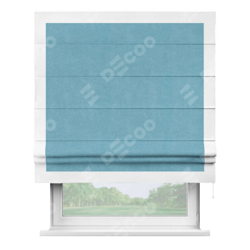 Римская штора производителя «Cortin», используется для проёма, пошита из ткани вельвет ментоловый, артикул ткани 10443. Отделка шторы кантом «Чесс», ткань для канта используется из вельвета разной расцветки на выбор. Имеет универсальный механизм и подходит для монтажа: на потолок, на стену и в нишу.