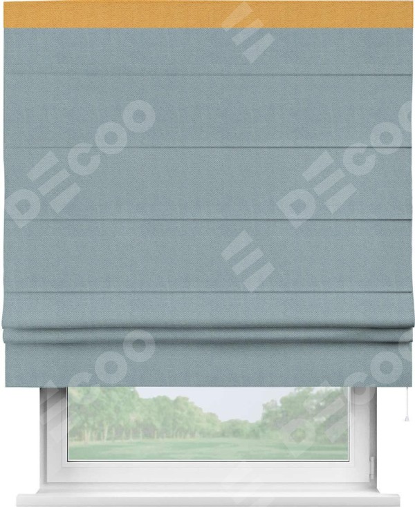 Римская штора производителя «Cortin», используется для проёма, пошита из ткани блэкаут с блеском синий, артикул 34625. Отделка шторы кантом «Кинг», ткань для канта используется из блэкаута с блеском разной расцветки на выбор. Изнаночная сторона материала черного цвета, что обеспечивает необходимую светонепроницаемость. Имеет универсальный механизм и подходит для монтажа: на потолок, на стену и в нишу.