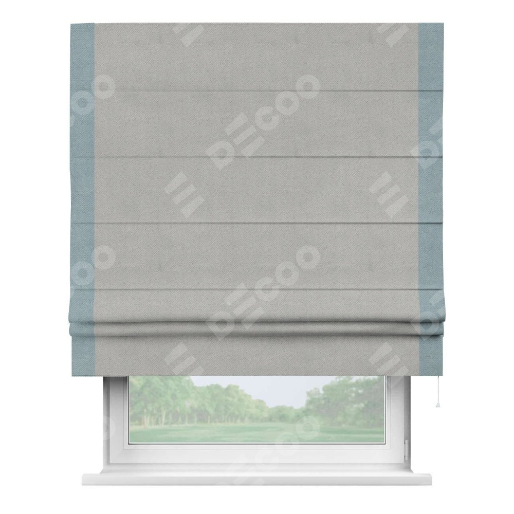 Римская штора производителя «Cortin», используется для проёма, пошита из ткани блэкаут с блеском тёмно-серый, артикул 34634. Отделка шторы кантом «Стрим Дуо», ткань для канта используется из блэкаута с блеском разной расцветки на выбор. Изнаночная сторона материала черного цвета, что обеспечивает необходимую светонепроницаемость. Имеет универсальный механизм и подходит для монтажа: на потолок, на стену и в нишу.