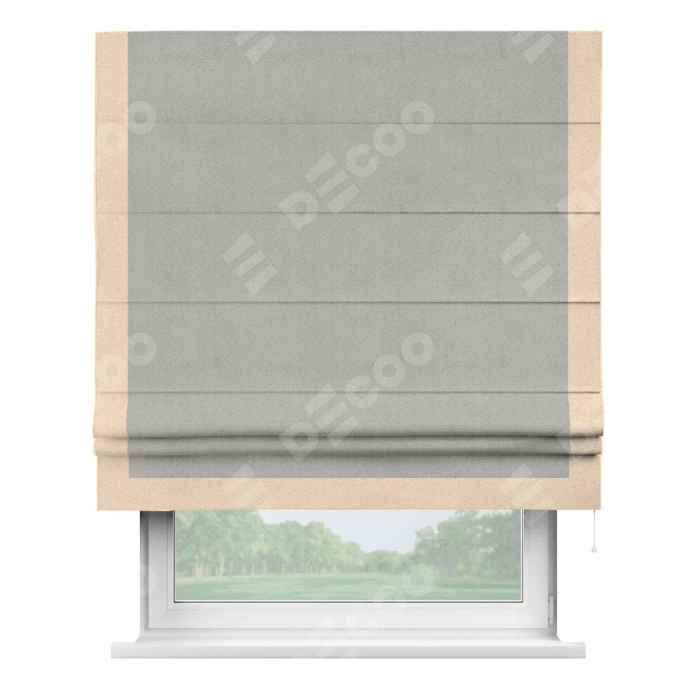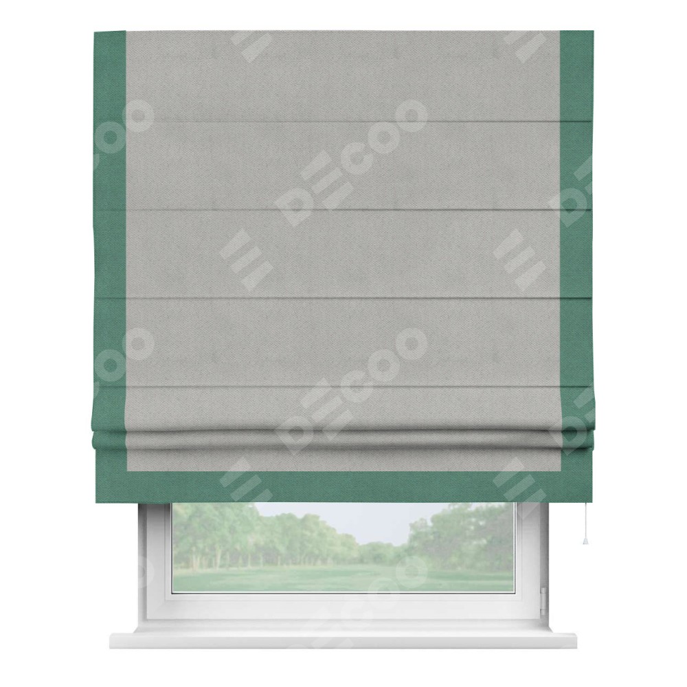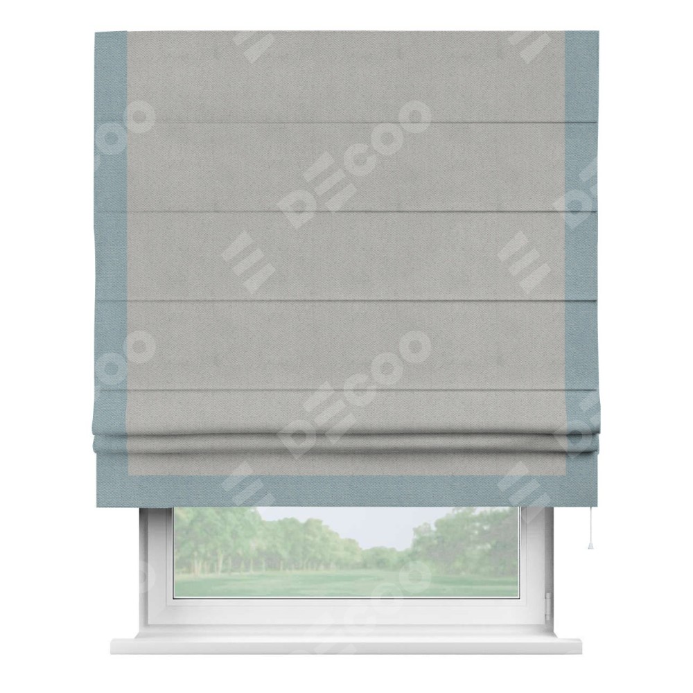Римская штора производителя «Cortin», используется для проёма, пошита из ткани блэкаут с блеском тёмно-серый, артикул 34634. Отделка шторы кантом «Виктория», ткань для канта используется из блэкаута с блеском разной расцветки на выбор. Изнаночная сторона материала черного цвета, что обеспечивает необходимую светонепроницаемость. Имеет универсальный механизм и подходит для монтажа: на потолок, на стену и в нишу.