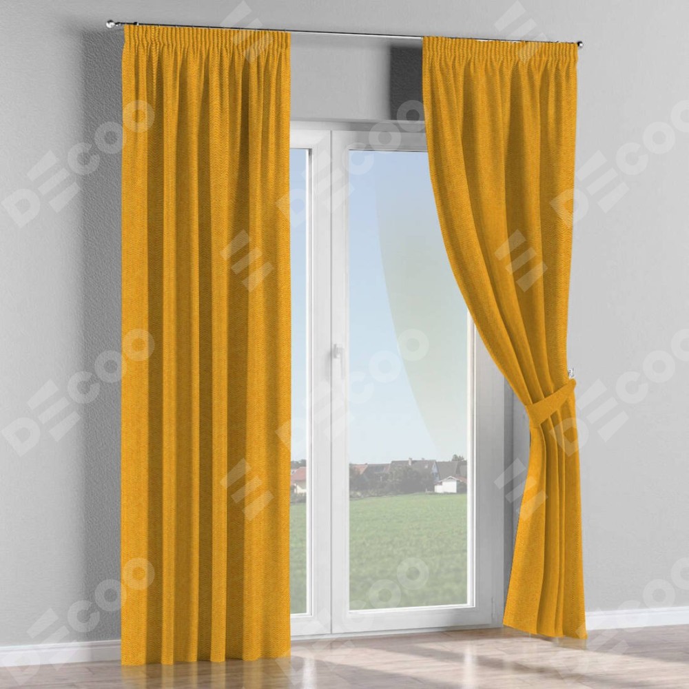 Комплект прямых штор, от производителя «Cortin», пошиты из ткани твид блэкаут медово-желтый, артикул ткани 21641. С изнаночной стороны в верхней части штор пристрачивается шторная лента с декоративными складками «Карандаш». Для создания элегантных складок прямые шторы шьются по стандарту с коэффициентом 1:2 (на 100 см. ширины проёма 200 см. ширины ткани).