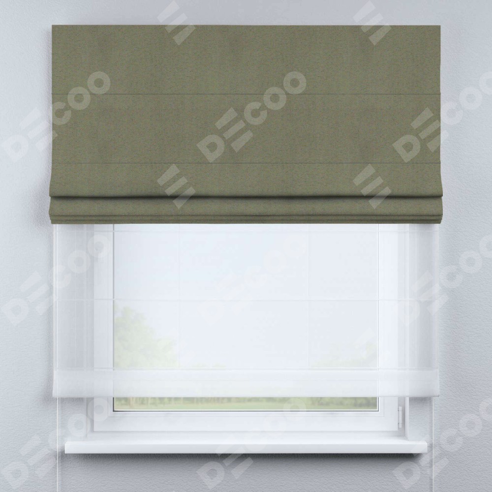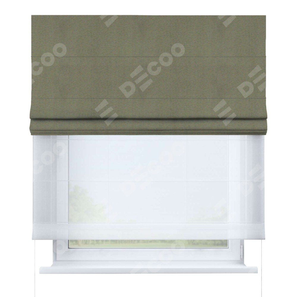 Римская штора день-ночь производителя «Cortin», используется для проёма, пошита из двух полотен, с лицевой стороны блэкаут однотонный серо-коричневый артикул 29568, вторая ткань тюль (по стандарту комплектуется тюль белого цвета артикул V-01). Имеет универсальный механизм и подходит для монтажа: на потолок, на стену и в нишу.