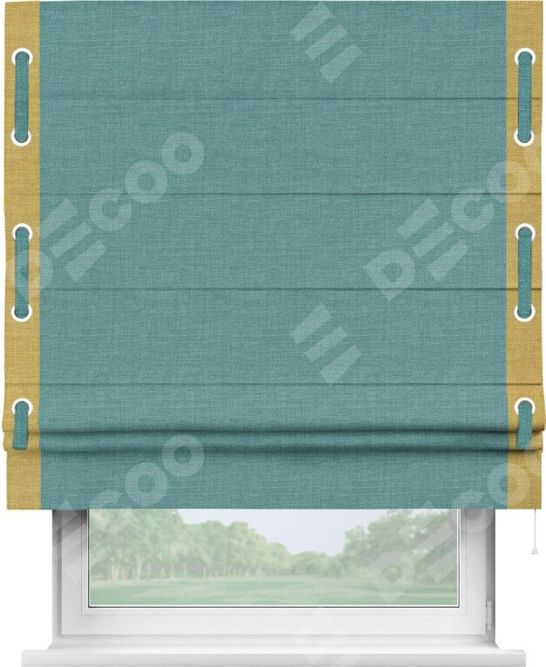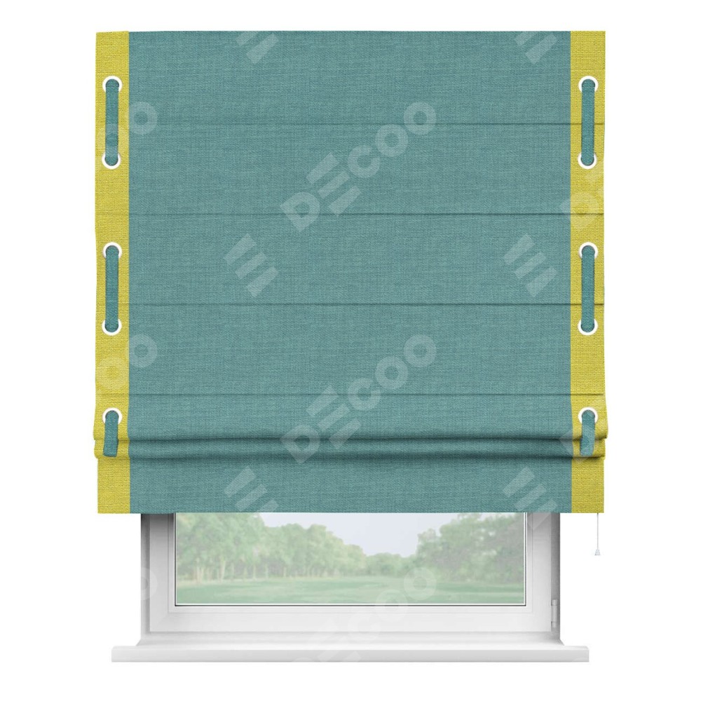 Римская штора производителя «Cortin», используется для проёма, пошита из ткани лён бирюза, артикул 7446. Отделка шторы кантом «Стрим Дуо» на кантах расположены люверсы с пояском, ткань для канта используется из льна разной расцветки на выбор. Ткань для пояска обычно используется из основной ткани шторы, а так же можно сделать из любой расцветки по желанию. Имеет универсальный механизм и подходит для монтажа: на потолок, на стену и в нишу.