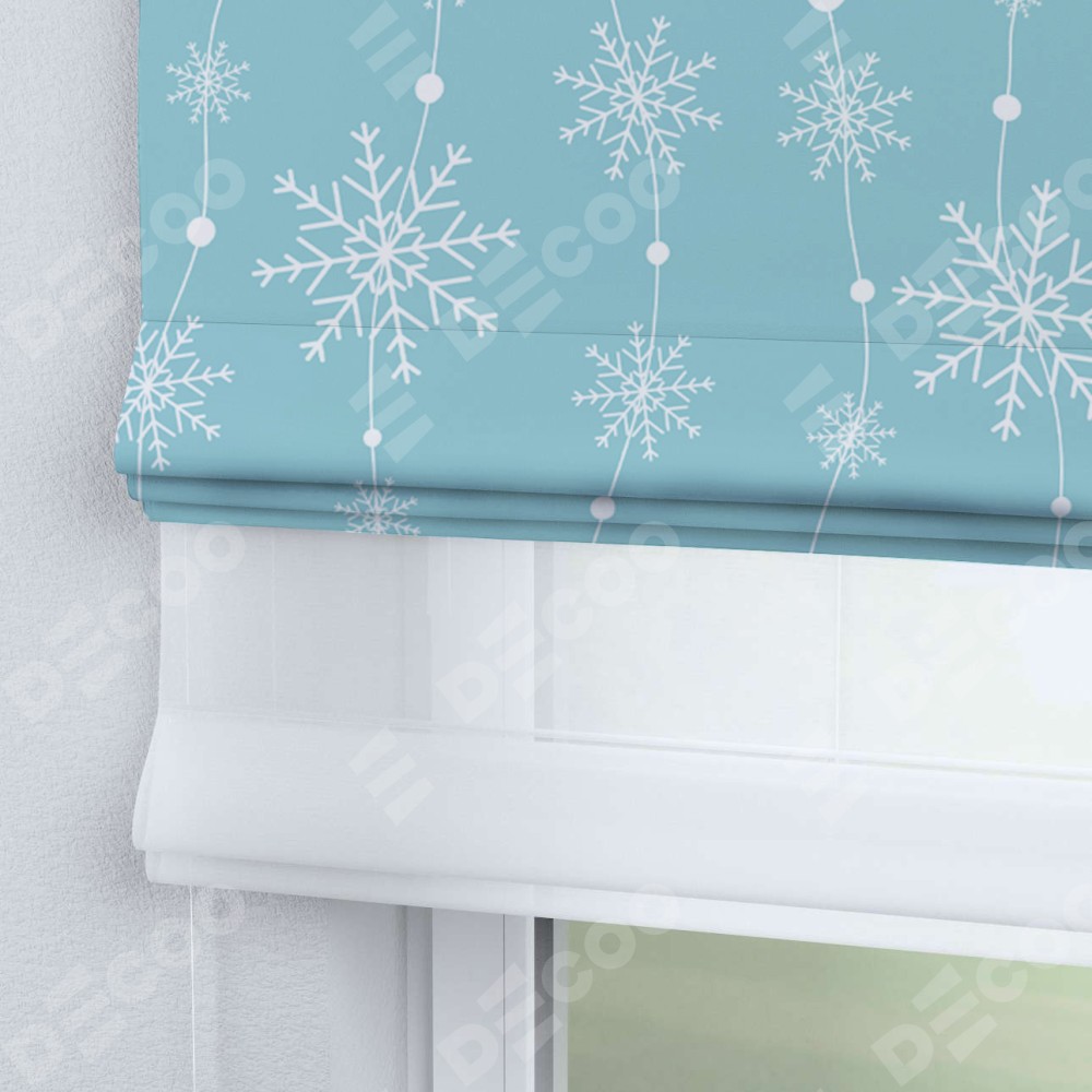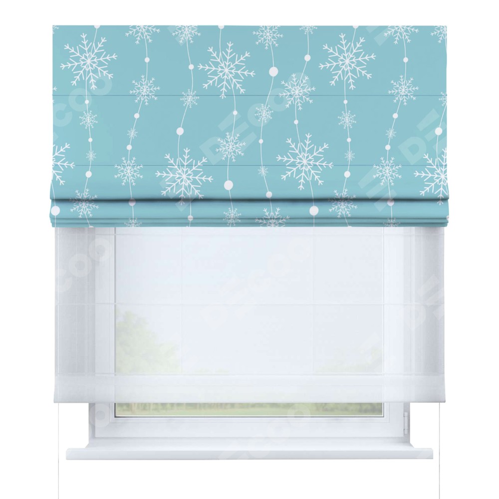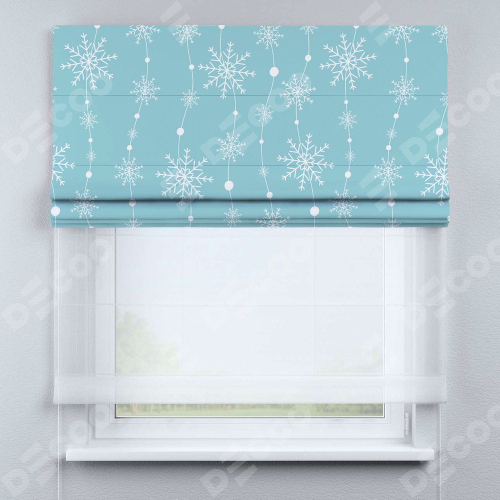 Римская штора день-ночь производителя «Cortin», используется для проёма, пошита из двух полотен, с лицевой блэкаут с нанесением сублимационной печати «Гирлянда из снежинок», вторая ткань тюль (по стандарту комплектуется тюль белого цвета артикул V-01). Имеет универсальный механизм и подходит для монтажа: на потолок, на стену и в нишу.