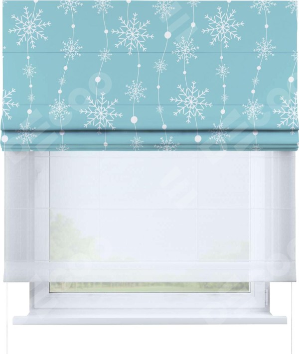 Римская штора день-ночь производителя «Cortin», используется для проёма, пошита из двух полотен, с лицевой блэкаут с нанесением сублимационной печати «Гирлянда из снежинок», вторая ткань тюль (по стандарту комплектуется тюль белого цвета артикул V-01). Имеет универсальный механизм и подходит для монтажа: на потолок, на стену и в нишу.