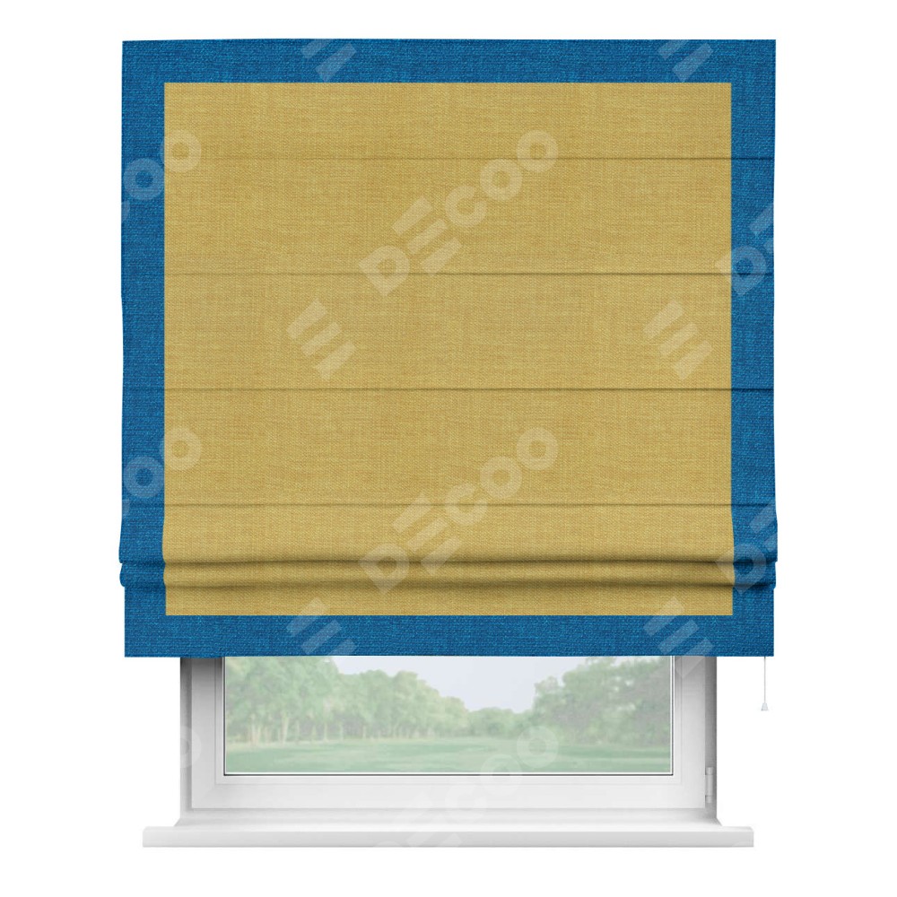 Римская штора производителя «Cortin», используется для проёма, пошита из ткани лён горчичный, артикул 74740. Отделка шторы кантом «Чесс», ткань для канта используется из льна разной расцветки на выбор. Имеет универсальный механизм и подходит для монтажа: на потолок, на стену и в нишу.