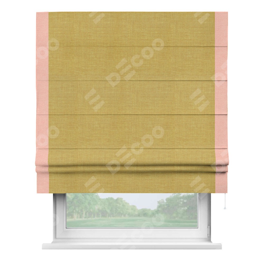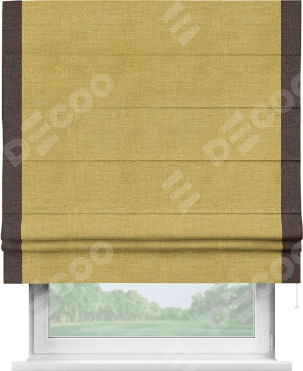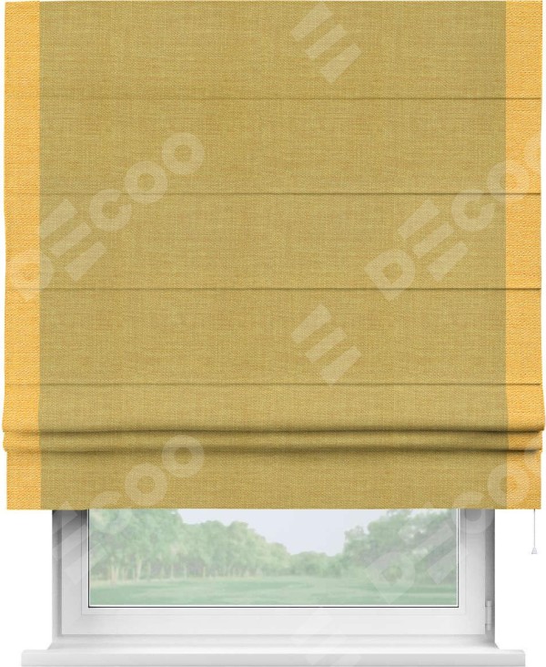 Римская штора производителя «Cortin», используется для проёма, пошита из ткани лён горчичный, артикул 74740. Отделка шторы кантом «Стрим Дуо», ткань для канта используется из льна разной расцветки на выбор. Имеет универсальный механизм и подходит для монтажа: на потолок, на стену и в нишу.