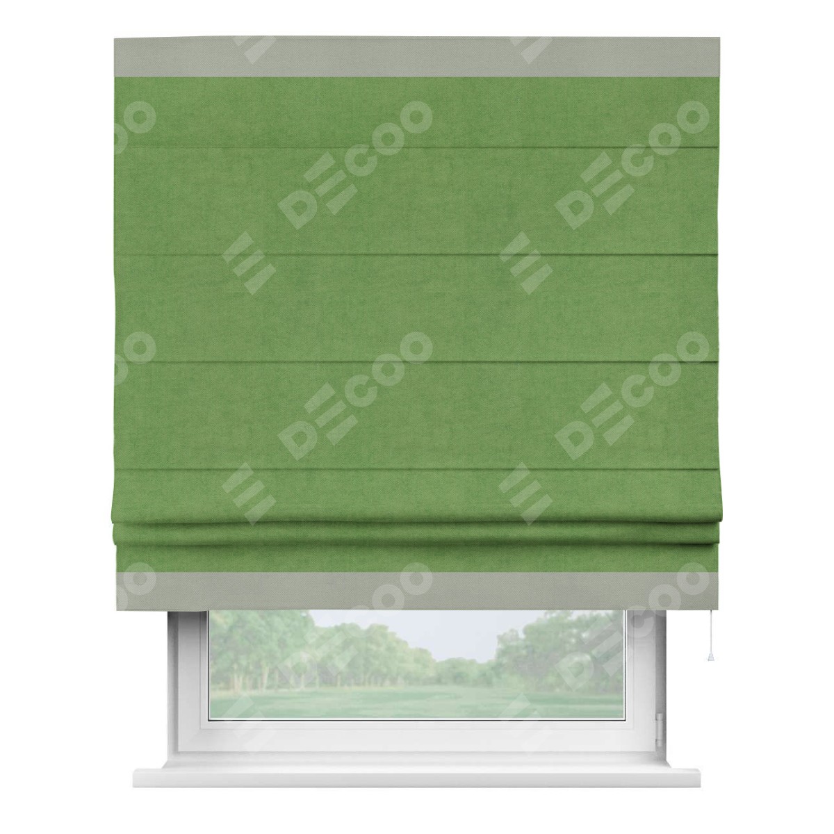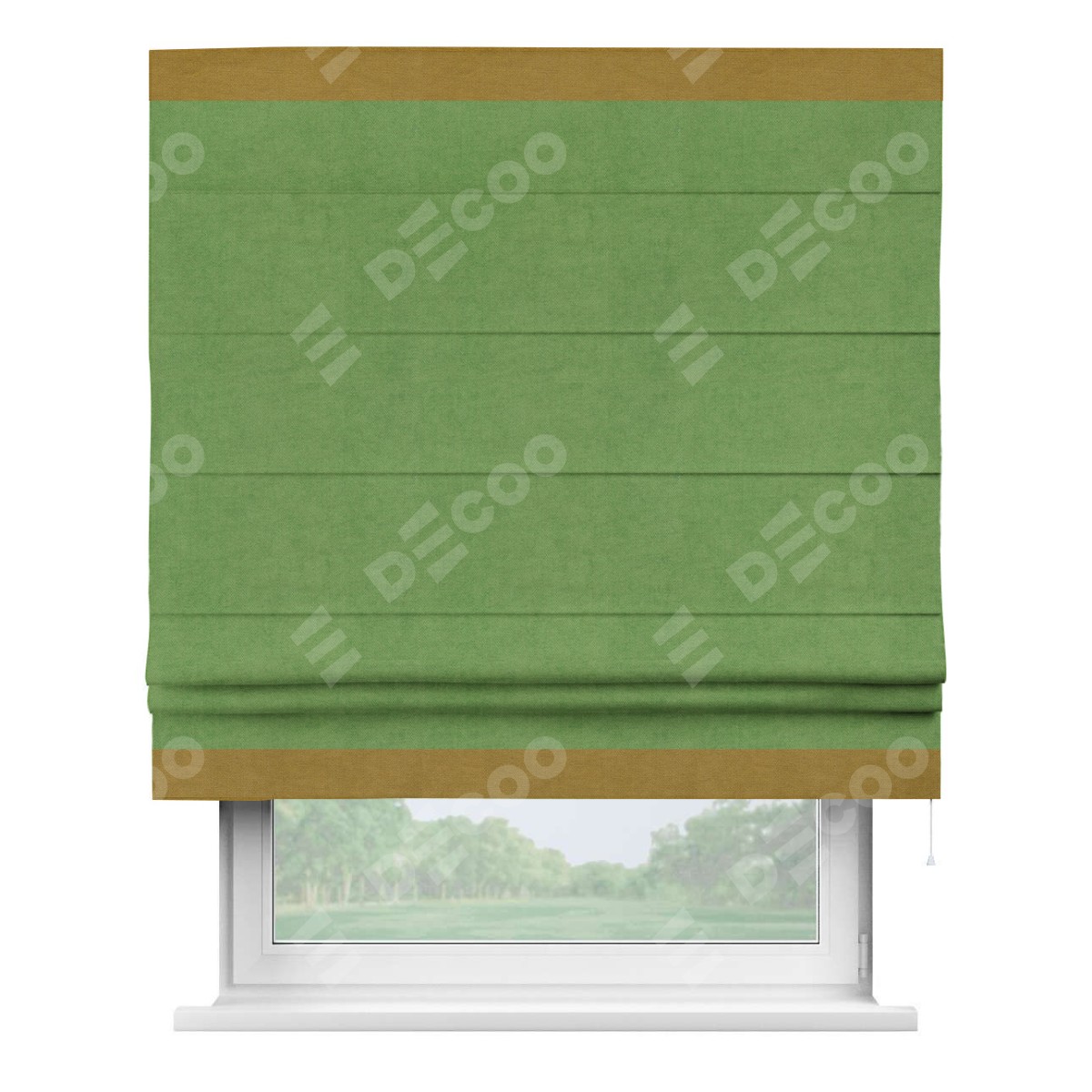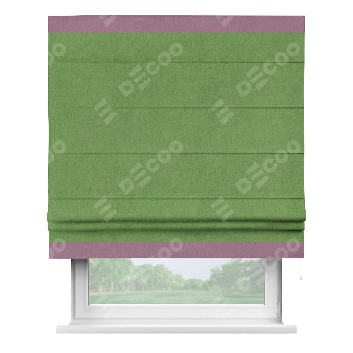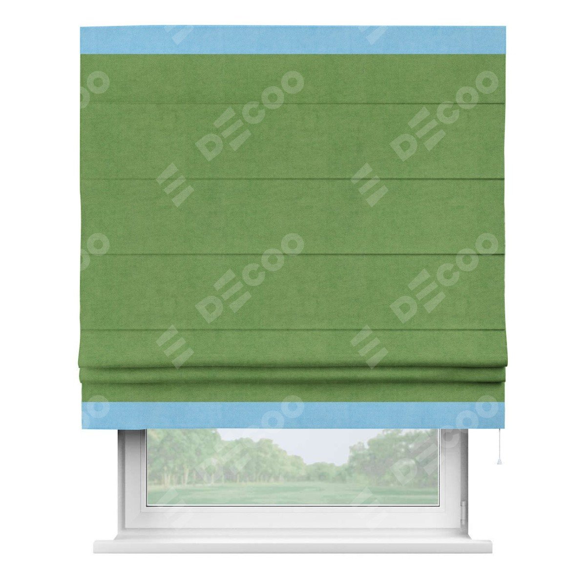 Римская штора производителя «Cortin», используется для проёма, пошита из ткани вельвет салатовый, артикул ткани 87072. Отделка шторы кантом «Горизонт», ткань для канта используется из вельвета разной расцветки на выбор. Имеет универсальный механизм и подходит для монтажа: на потолок, на стену и в нишу.