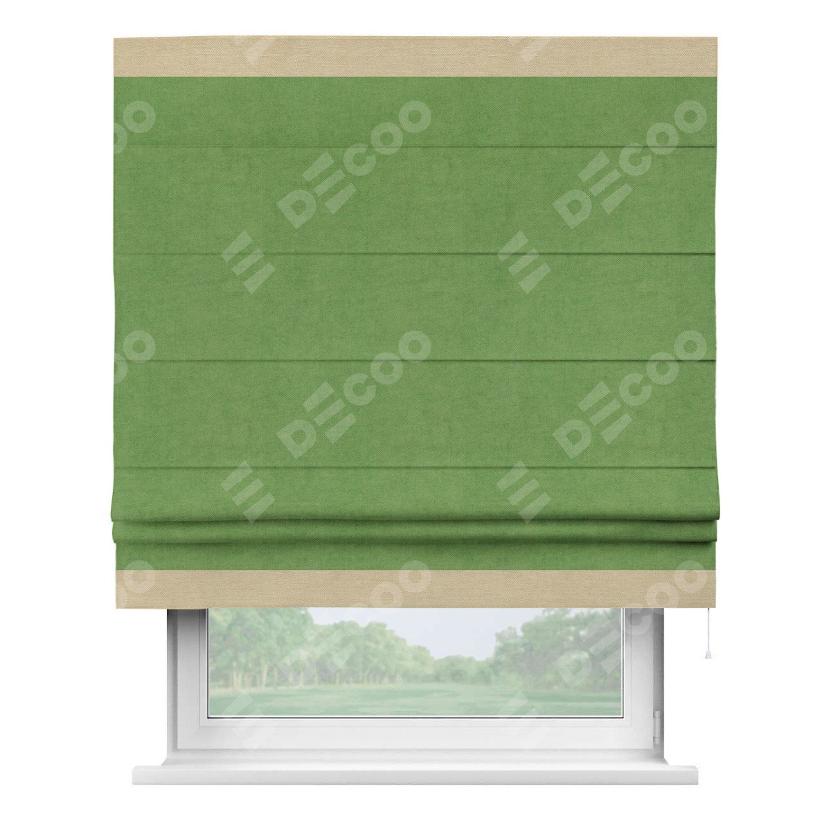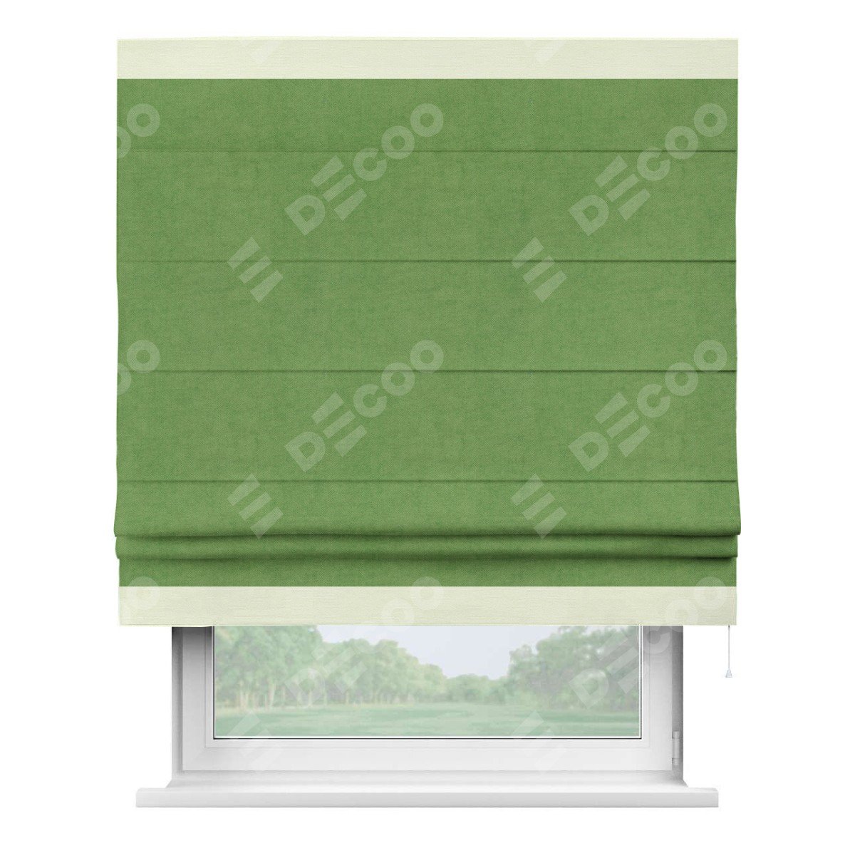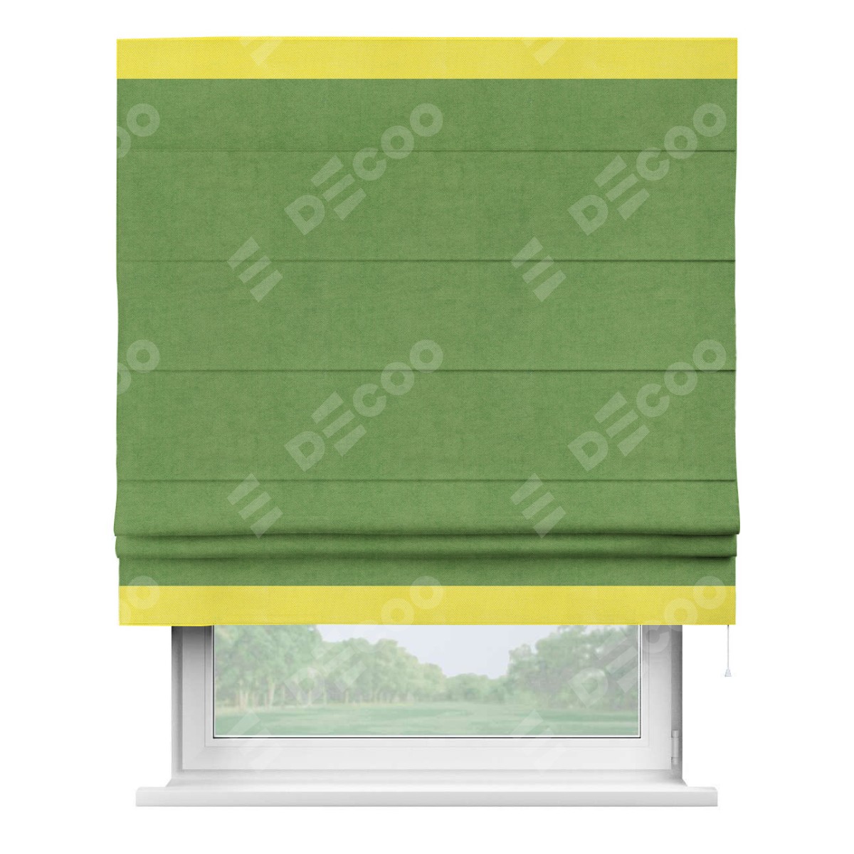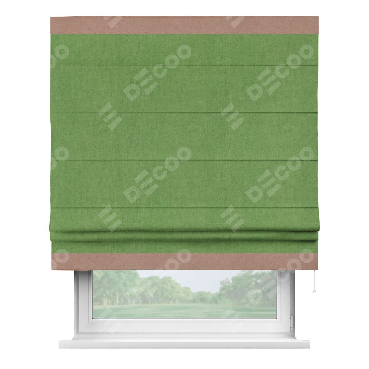 Римская штора производителя «Cortin», используется для проёма, пошита из ткани вельвет салатовый, артикул ткани 87072. Отделка шторы кантом «Горизонт», ткань для канта используется из вельвета разной расцветки на выбор. Имеет универсальный механизм и подходит для монтажа: на потолок, на стену и в нишу.
