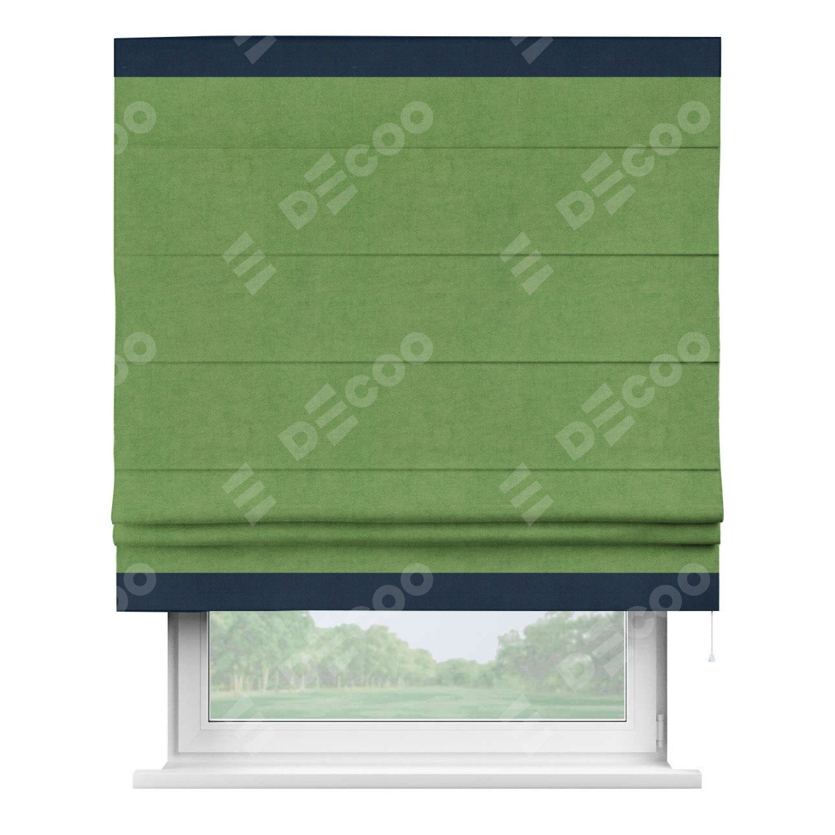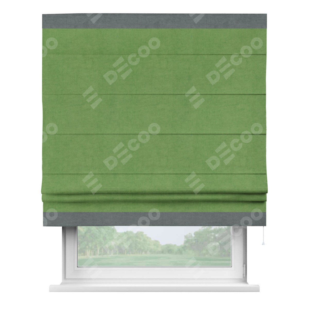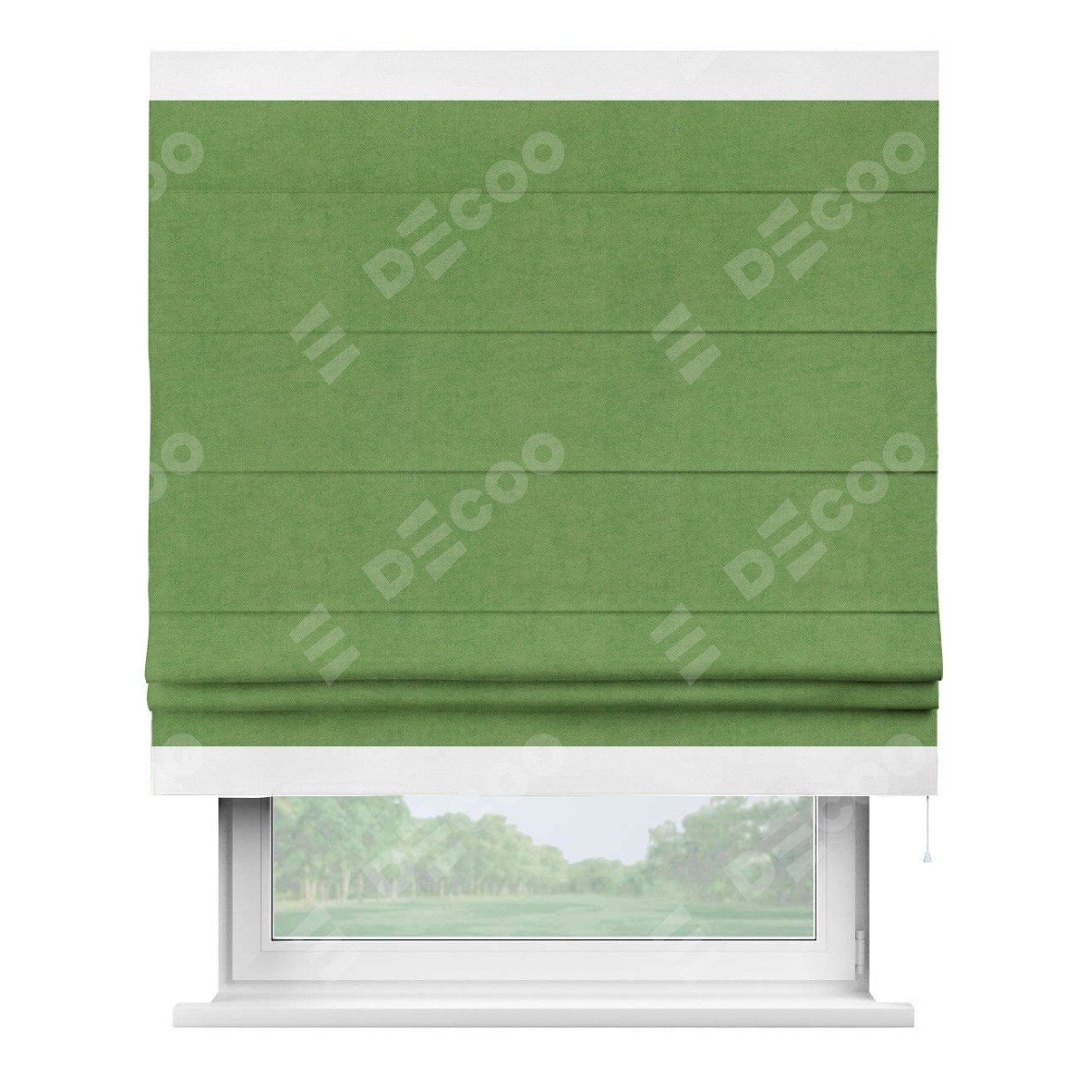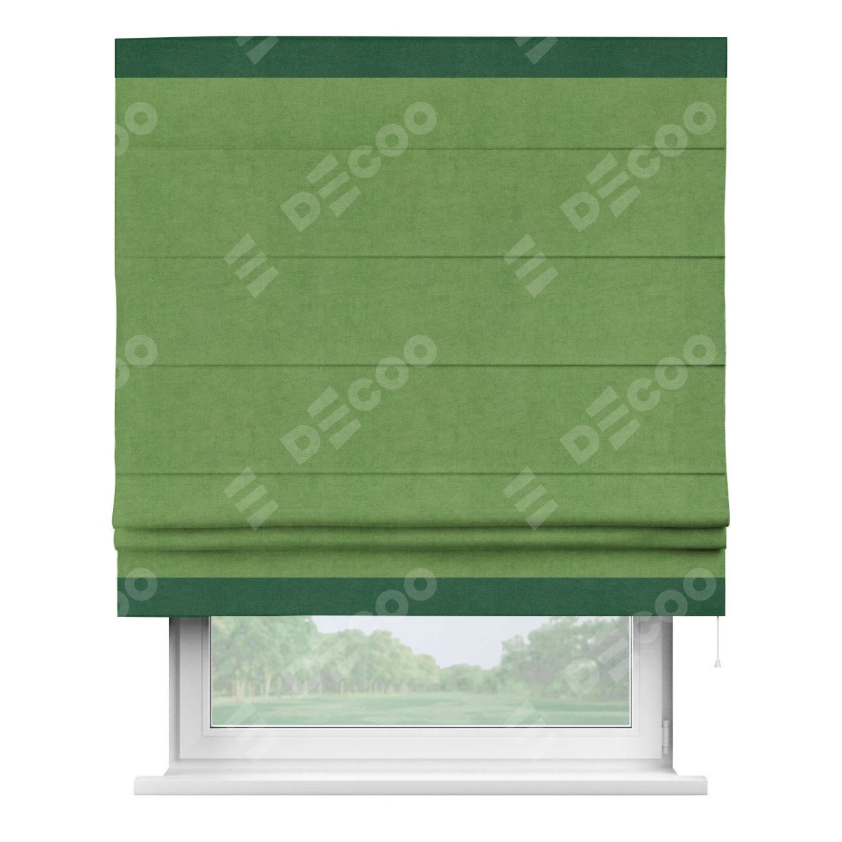 Римская штора производителя «Cortin», используется для проёма, пошита из ткани вельвет салатовый, артикул ткани 87072. Отделка шторы кантом «Горизонт», ткань для канта используется из вельвета разной расцветки на выбор. Имеет универсальный механизм и подходит для монтажа: на потолок, на стену и в нишу.