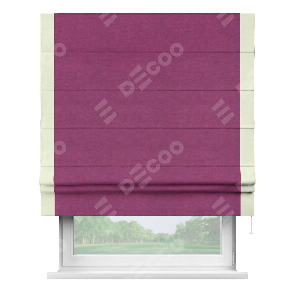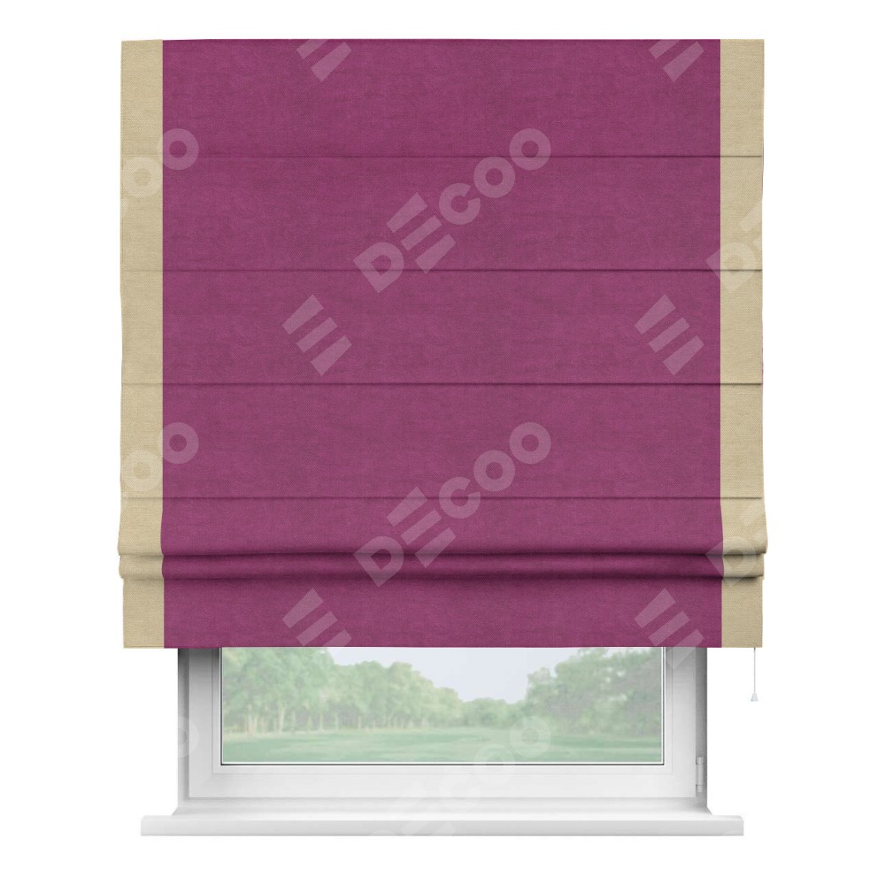 Римская штора производителя «Cortin», используется для проёма, пошита из ткани вельвет фиолетовый, артикул ткани 85552. Отделка шторы кантом «Стрим Дуо», ткань для канта используется из вельвета разной расцветки на выбор. Имеет универсальный механизм и подходит для монтажа: на потолок, на стену и в нишу.