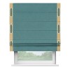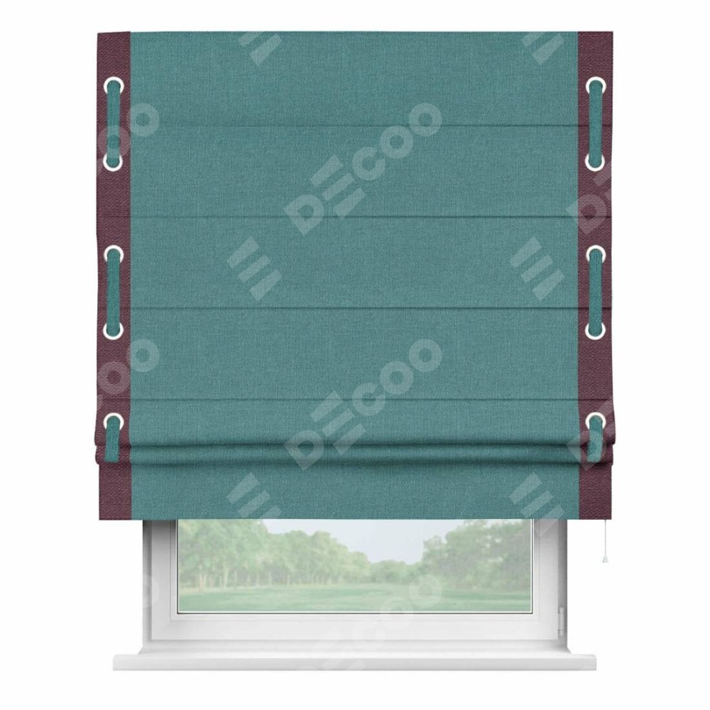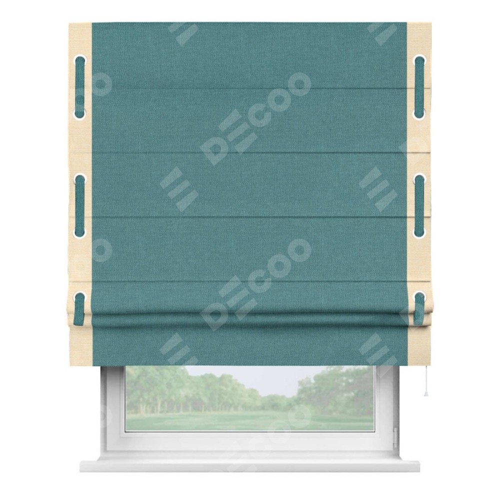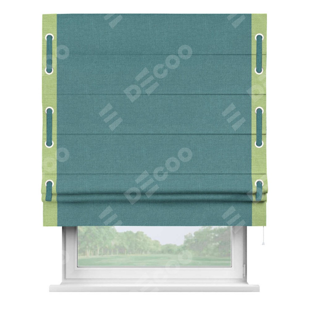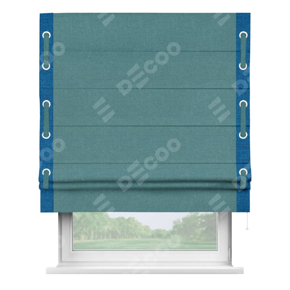 Римская штора производителя «Cortin», используется для проёма, пошита из ткани лён бирюзовый, артикул 53436. Отделка шторы кантом «Стрим Дуо» на кантах расположены люверсы с пояском, ткань для канта используется из льна разной расцветки на выбор. Ткань для пояска обычно используется из основной ткани шторы, а так же можно сделать из любой расцветки по желанию. Имеет универсальный механизм и подходит для монтажа: на потолок, на стену и в нишу.