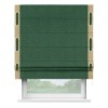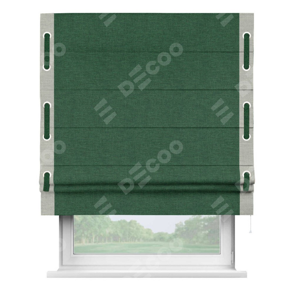 Римская штора производителя «Cortin», используется для проёма, пошита из ткани лён серо-зеленый, артикул 63740. Отделка шторы кантом «Стрим Дуо» на кантах расположены люверсы с пояском, ткань для канта используется из льна разной расцветки на выбор. Ткань для пояска обычно используется из основной ткани шторы, а так же можно сделать из любой расцветки по желанию. Имеет универсальный механизм и подходит для монтажа: на потолок, на стену и в нишу.