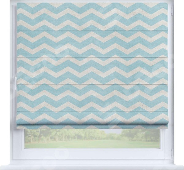 Римская штора производителя «Cortin», устанавливается на створку окна, пошита из ткани блэкаут с нанесением сублимационной печати «Голубой шеврон». Штора шьётся по индивидуальным размерам, для данного типа римской шторы возможная ширина от 35 до 150 см., высота до 250 см.