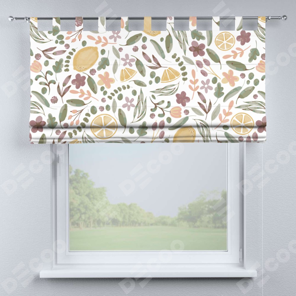 Римская штора производителя «Cortin», используется для проёма, пошита из ткани блэкаут с нанесением сублимационной печати «Лимоны и цветы». Данная модель пошита на петлях, комплектуется на выбор круглым карнизом и подходит для монтажа на стену. Римская штора на петлях имеет простую систему регулировки высоты, отличительным преимуществом данной модели является простой способ монтажа. Достаточно повесить ее на трубу и штора готова!