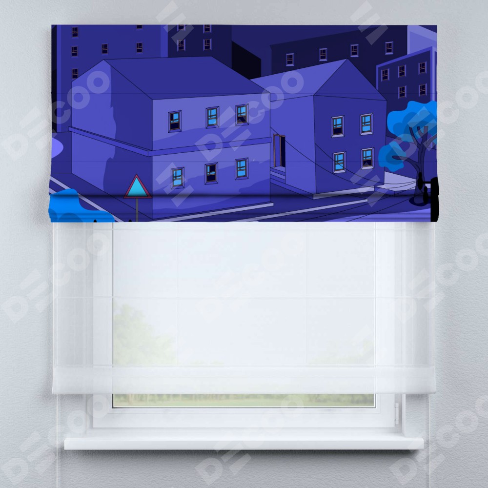 Римская штора день-ночь производителя «Cortin», используется для проёма, пошита из двух полотен, с лицевой блэкаут с нанесением сублимационной печати «Ночные улицы», вторая ткань тюль (по стандарту комплектуется тюль белого цвета артикул V-01). Имеет универсальный механизм и подходит для монтажа: на потолок, на стену и в нишу.