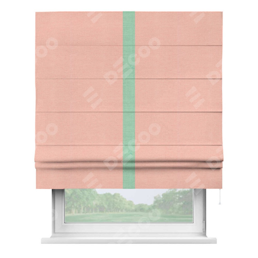 Римская штора производителя «Cortin», используется для проёма, пошита из ткани лён розовый, артикул 00005. Отделка шторы кантом «Хайвэй», ткань для канта используется из льна разной расцветки на выбор. Имеет универсальный механизм и подходит для монтажа: на потолок, на стену и в нишу.