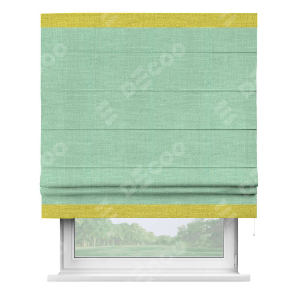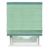 Римская штора производителя «Cortin», используется для проёма, пошита из ткани лён светло-бирюзовый, артикул 74737. Отделка шторы кантом «Горизонт», ткань для канта используется из льна разной расцветки на выбор. Имеет универсальный механизм и подходит для монтажа: на потолок, на стену и в нишу.