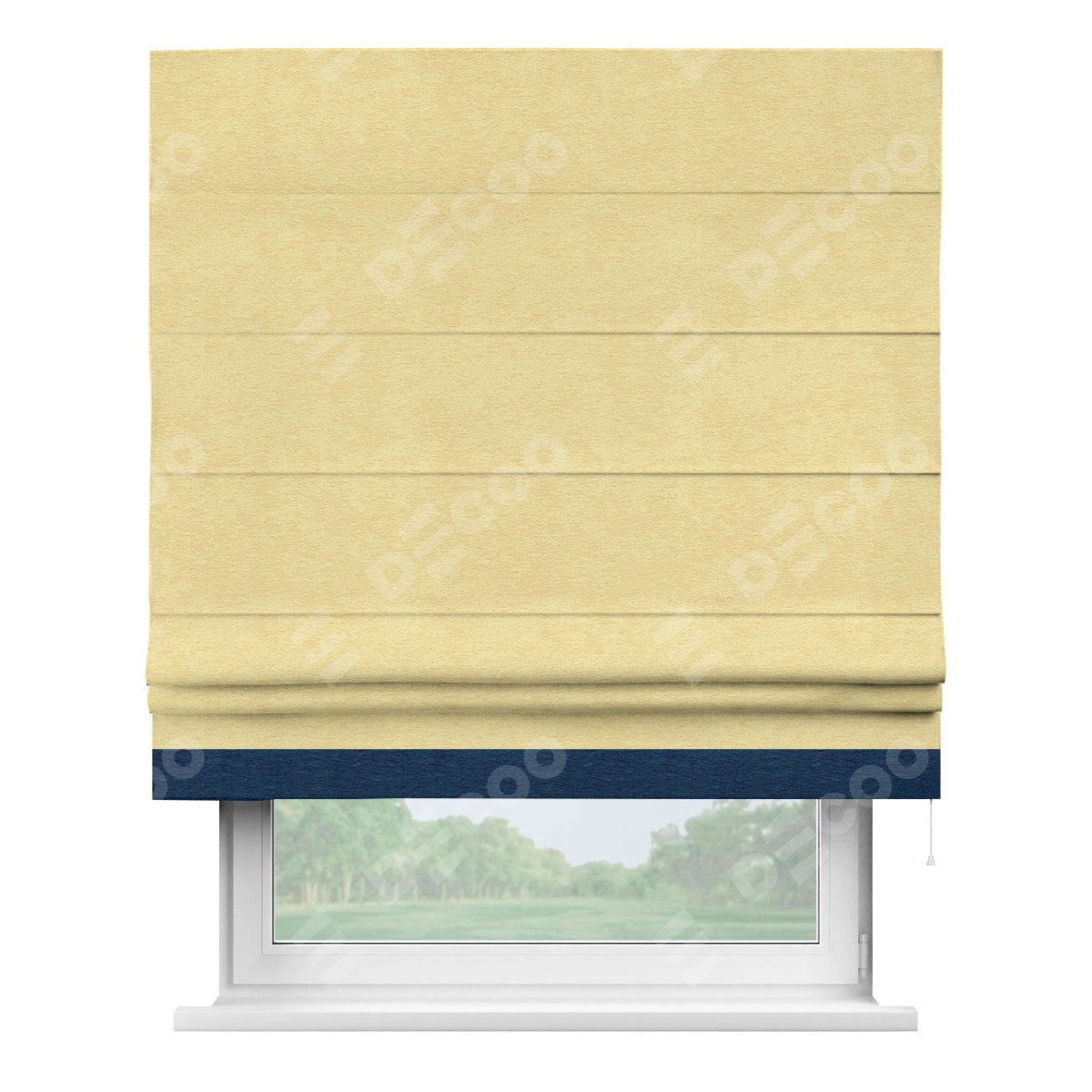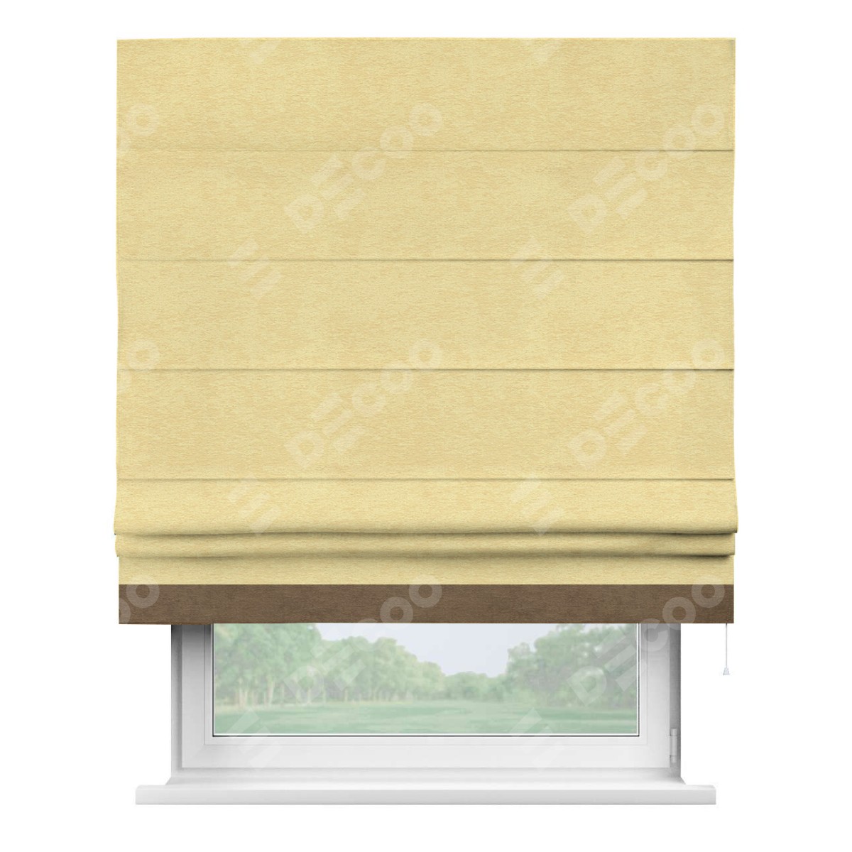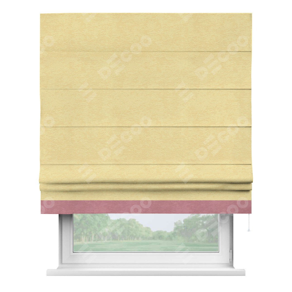 Римская штора производителя «Cortin», используется для проёма, пошита из ткани софт однотонный золотой, артикул 42934. Отделка шторы кантом «Джестер», ткань для канта используется из софта разной расцветки на выбор. Имеет универсальный механизм и подходит для монтажа: на потолок, на стену и в нишу.