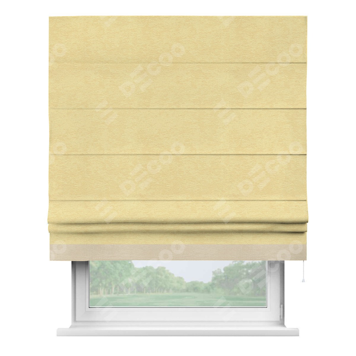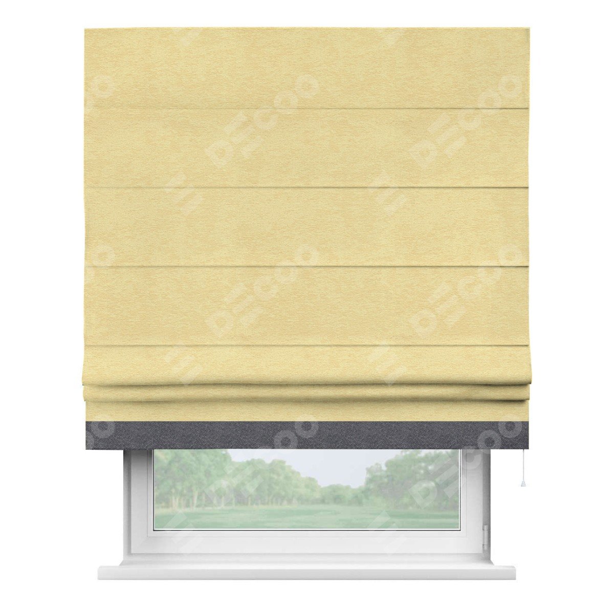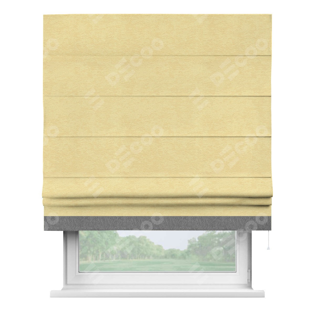 Римская штора производителя «Cortin», используется для проёма, пошита из ткани софт однотонный золотой, артикул 42934. Отделка шторы кантом «Джестер», ткань для канта используется из софта разной расцветки на выбор. Имеет универсальный механизм и подходит для монтажа: на потолок, на стену и в нишу.
