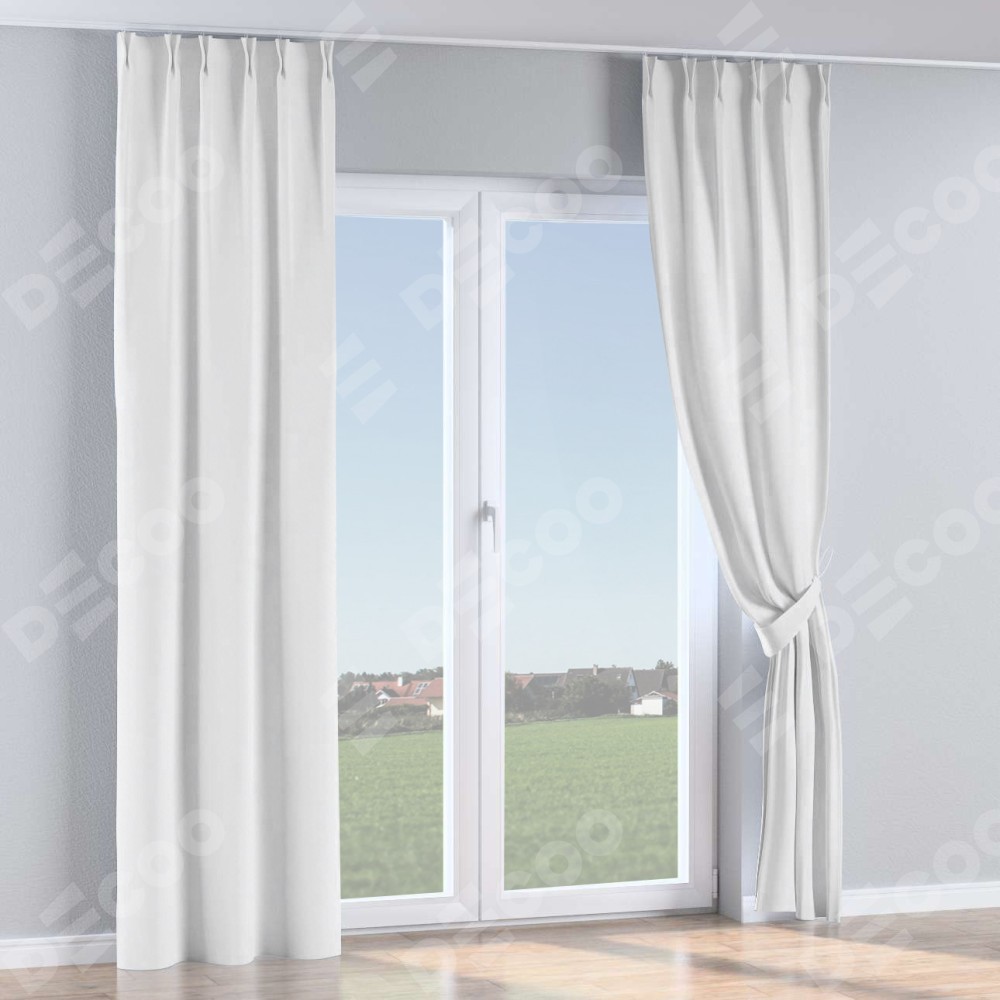 Комплект прямых штор, от производителя «Cortin», пошиты из ткани вельвет белоснежный, артикул ткани 19192. С изнаночной стороны в верхней части штор пристрачивается шторная лента с декоративными складками «Кустик». Для создания элегантных складок прямые шторы шьются по стандарту с коэффициентом 1:2 (на 100 см. ширины проёма 200 см. ширины ткани).