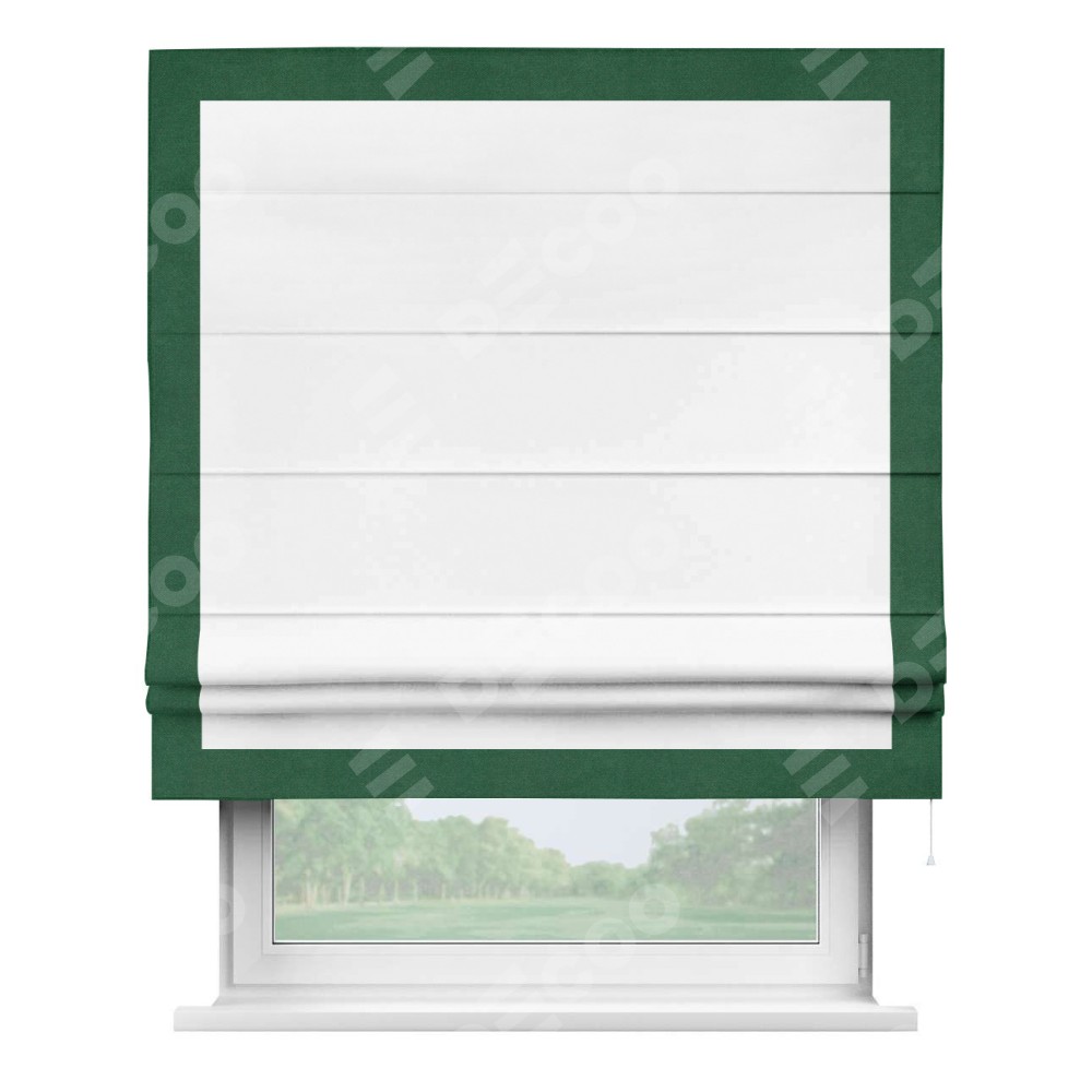 Римская штора производителя «Cortin», используется для проёма, пошита из ткани вельвет белоснежный, артикул ткани 19192. Отделка шторы кантом «Чесс», ткань для канта используется из вельвета разной расцветки на выбор. Имеет универсальный механизм и подходит для монтажа: на потолок, на стену и в нишу.