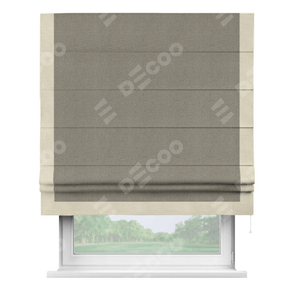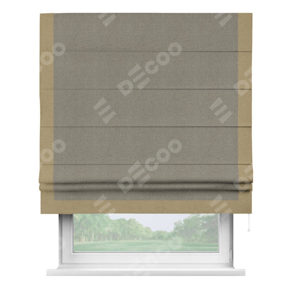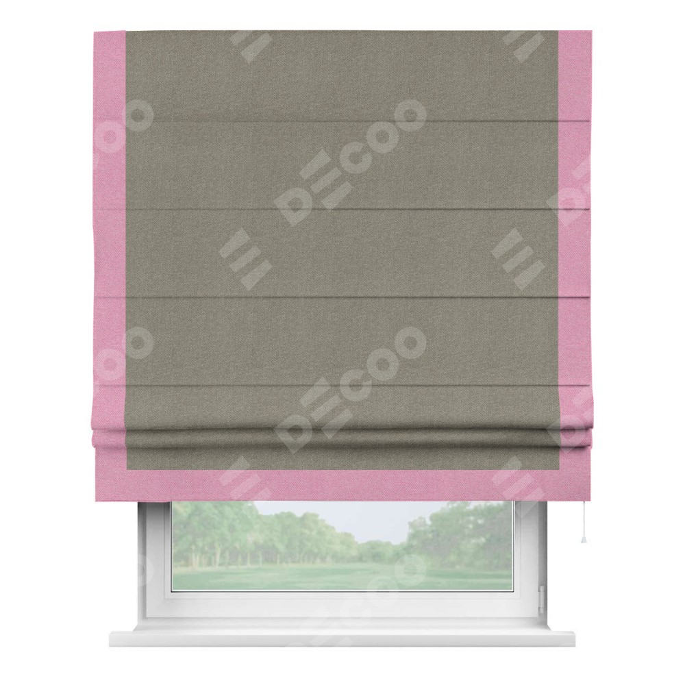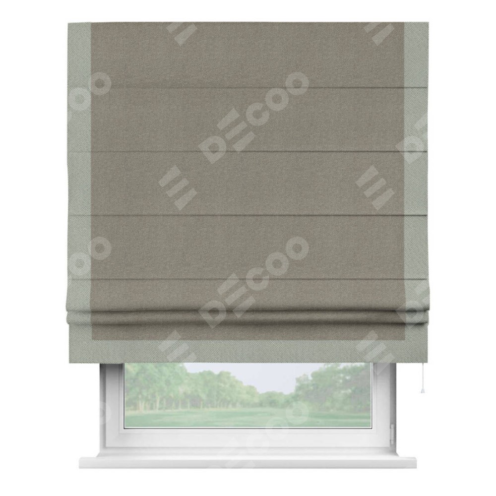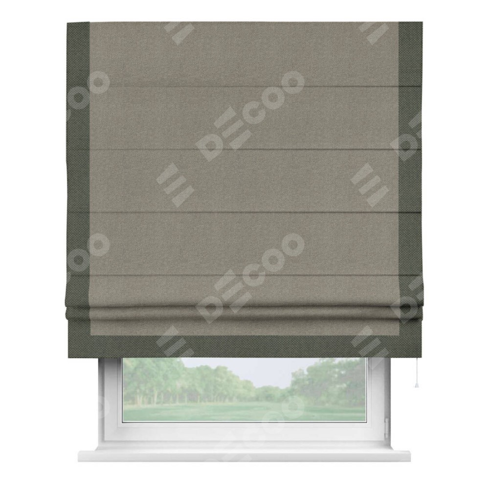 Римская штора производителя «Cortin», используется для проёма, пошита из ткани лён димаут cеро-зелёный, артикул 00003. Отделка шторы кантом «Виктория», ткань для канта используется из льна димаут разной расцветки на выбор. Имеет универсальный механизм и подходит для монтажа: на потолок, на стену и в нишу.