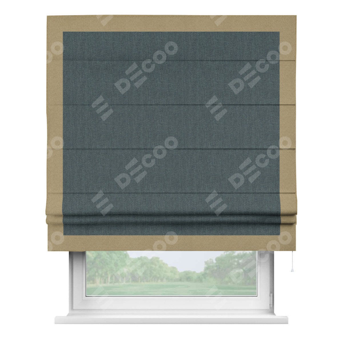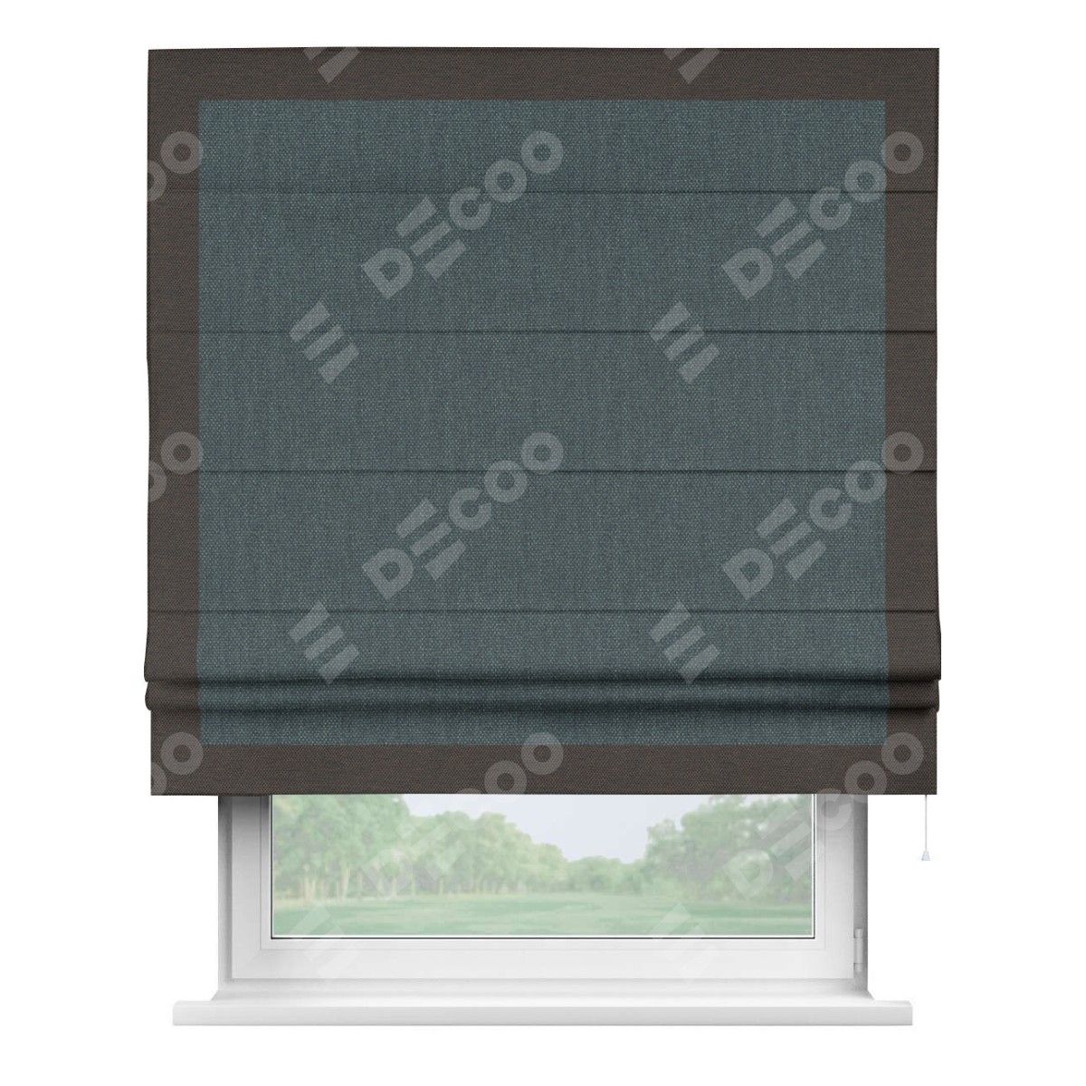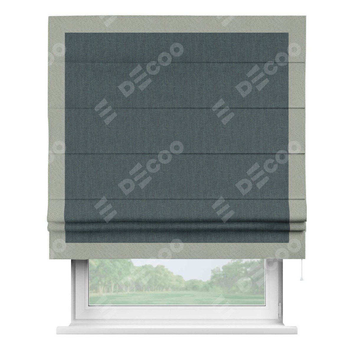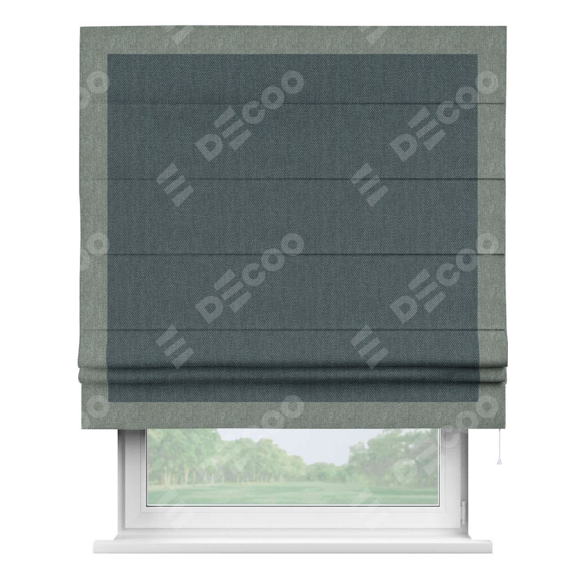 Римская штора «Кортин» с кантом Чесс, для проема, ткань лён димаут, серо-синий