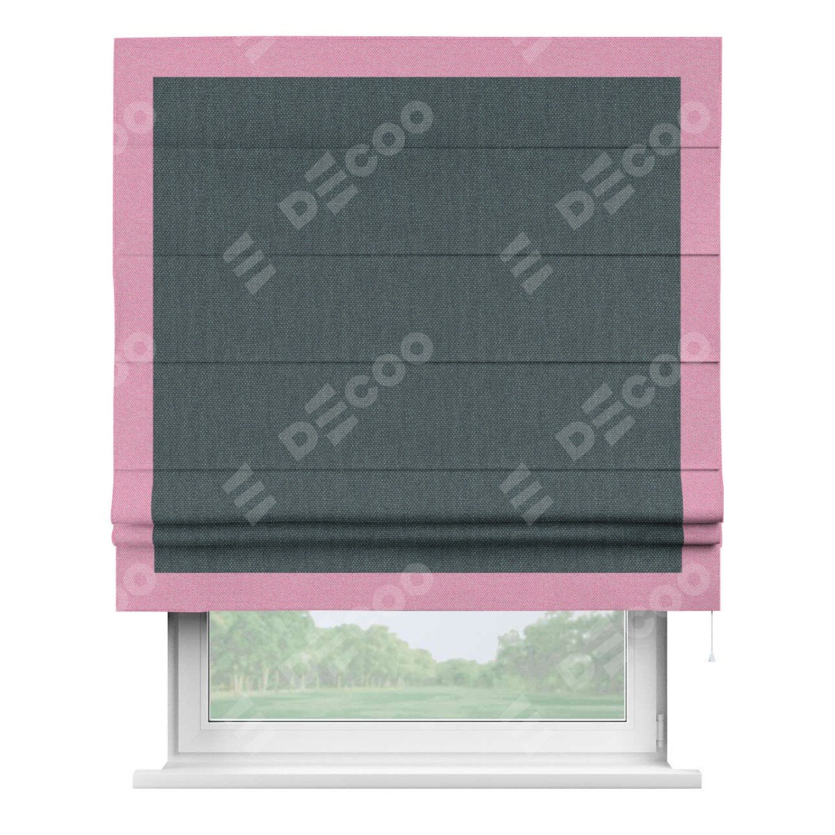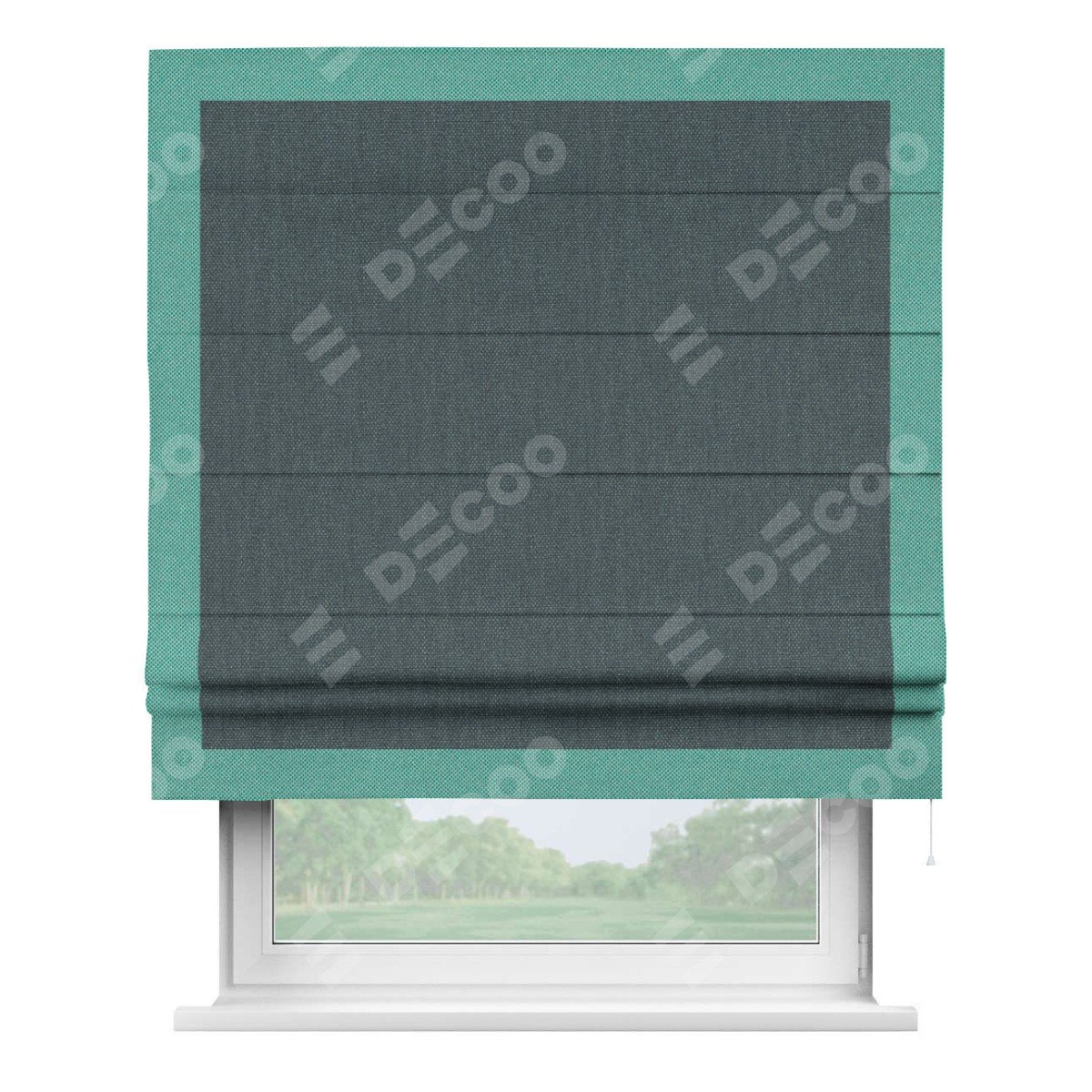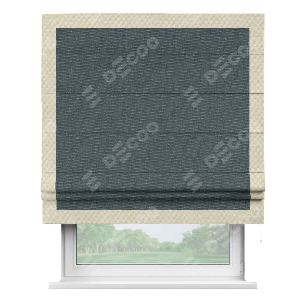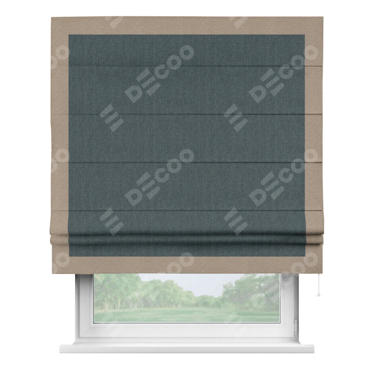 Римская штора «Кортин» с кантом Чесс, для проема, ткань лён димаут, серо-синий